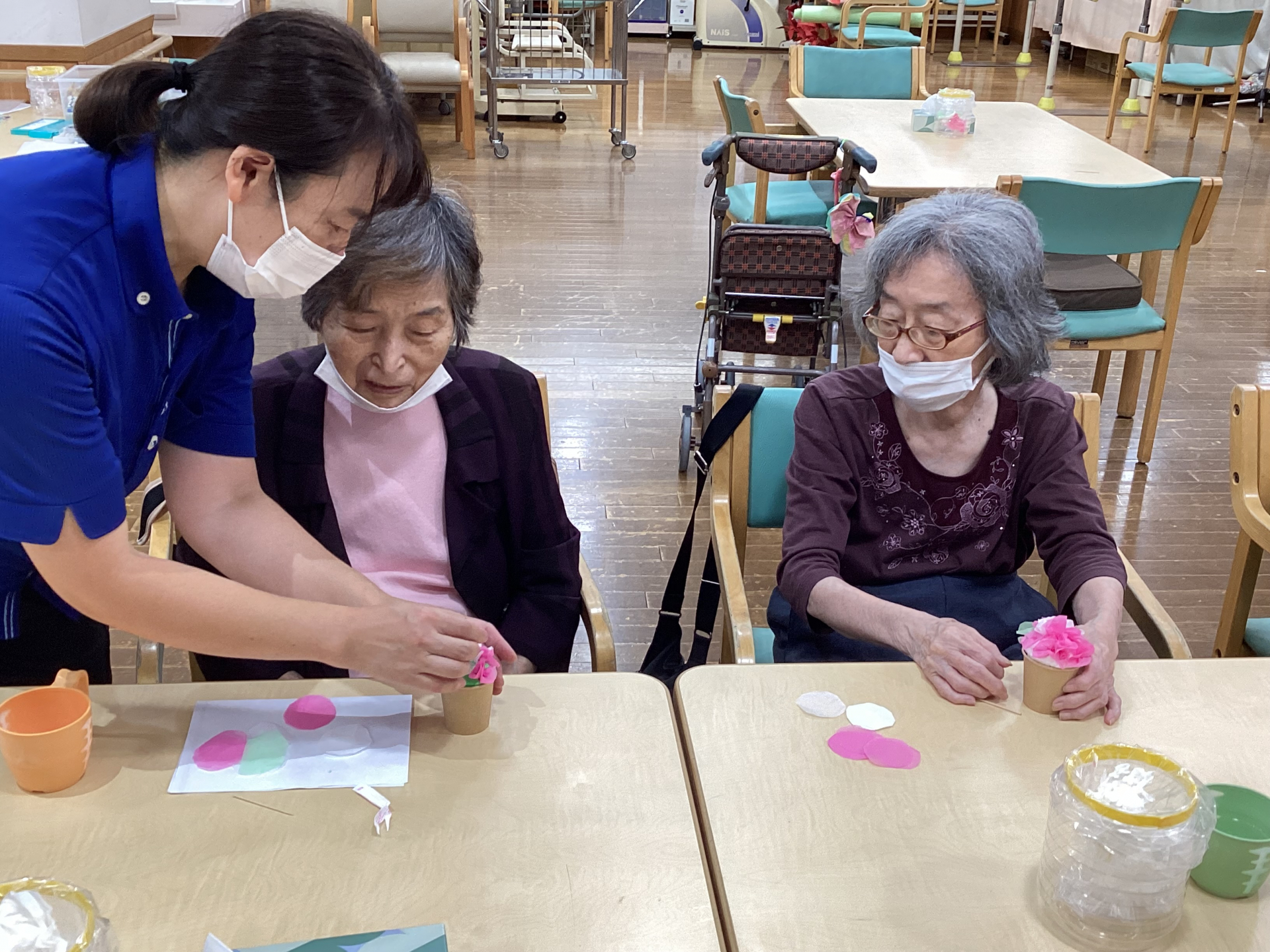 座って出来る体操や、せらばんころばん体操の後、お花紙とふわふわ紙粘土を使用した、フラワーカップ制作をしました♪