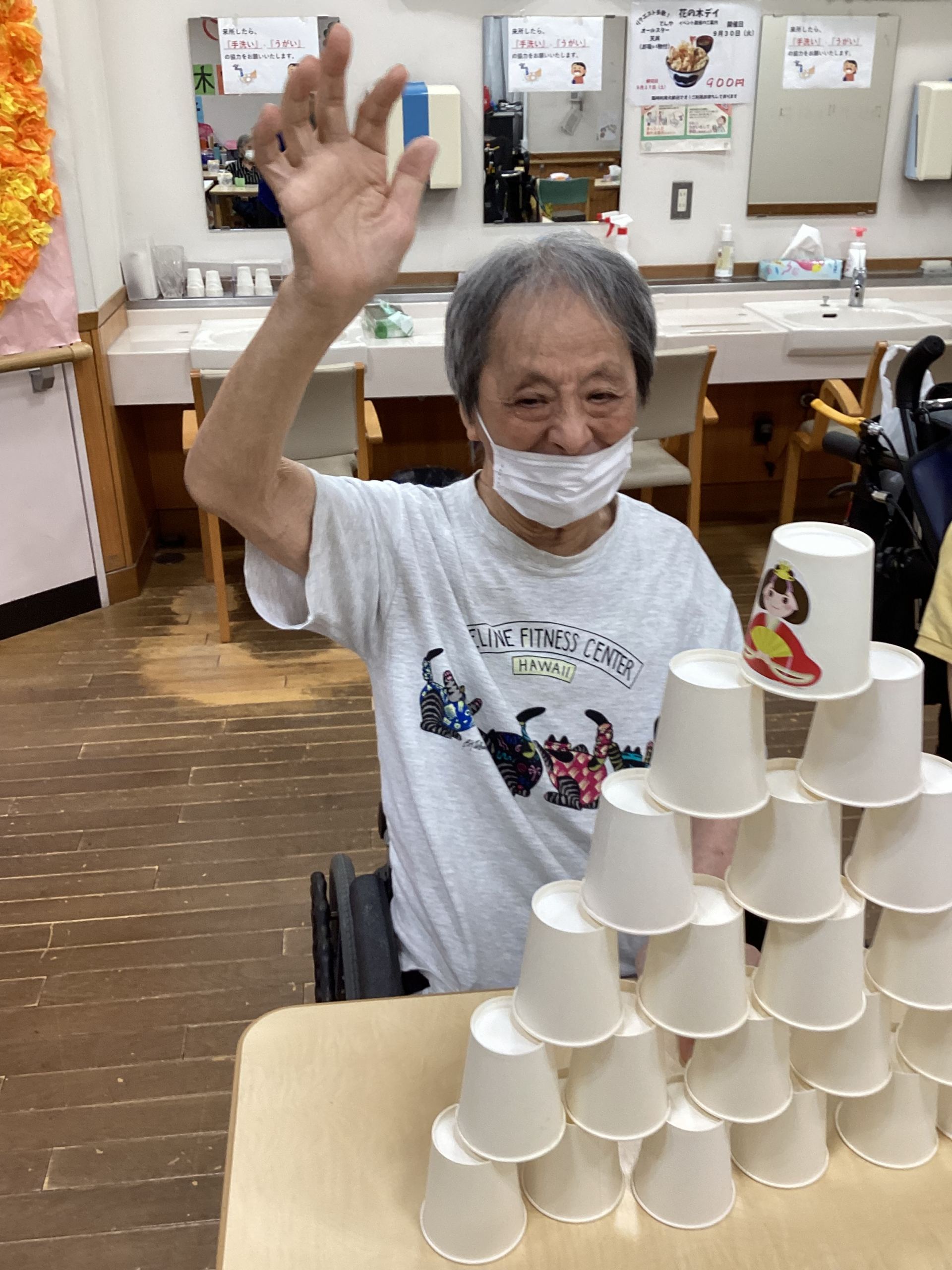 本日は自由時間に行った紙コップ並べの様子をアップさせていただきます!