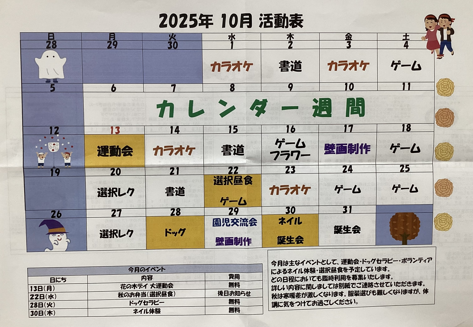 今月は、運動会、選択昼食、ネイルボランティア、ドッグセラピー等、行事が行われる予定です。