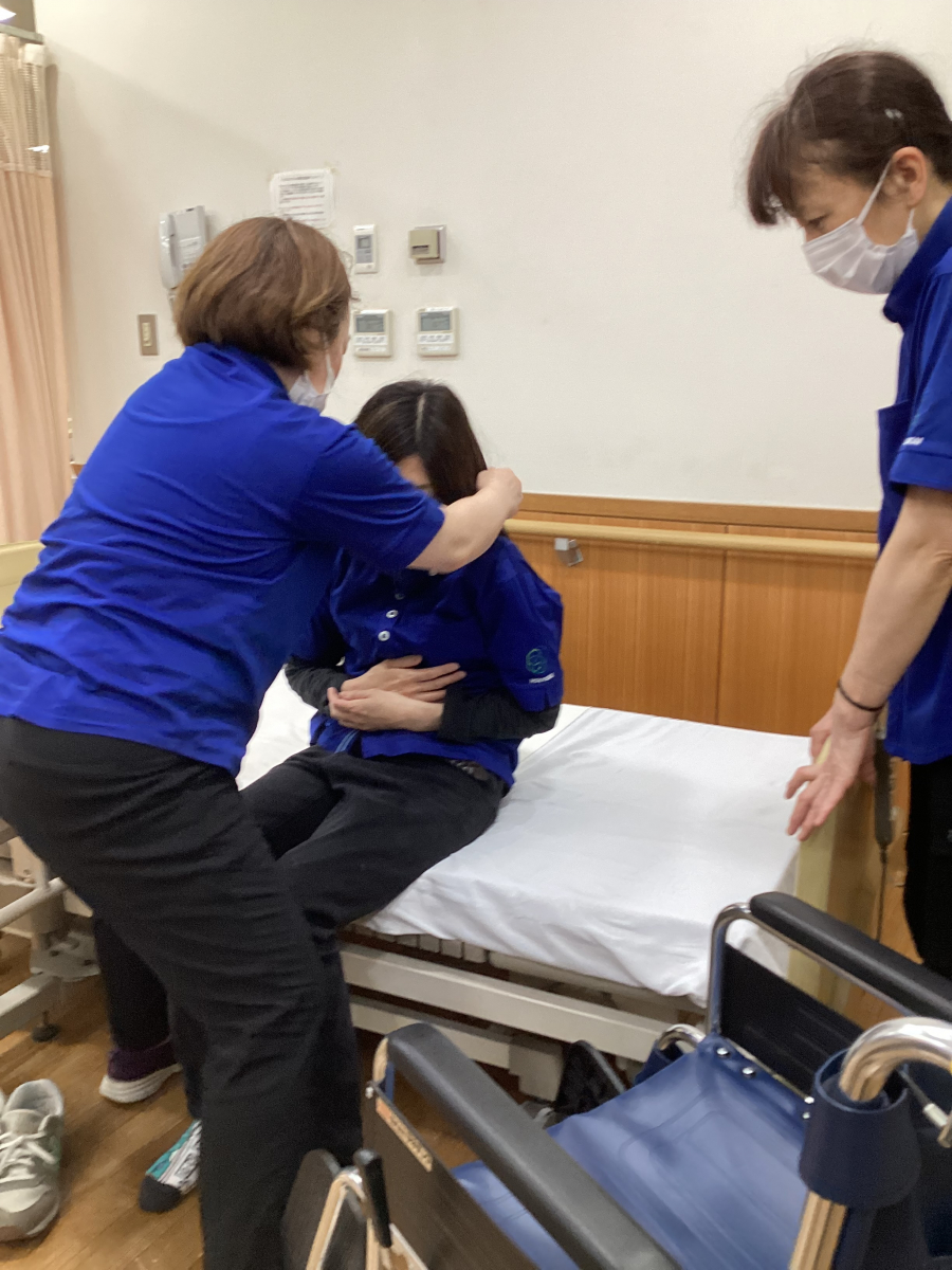 今回は車椅子からベッドへの移乗をメインに行いました。