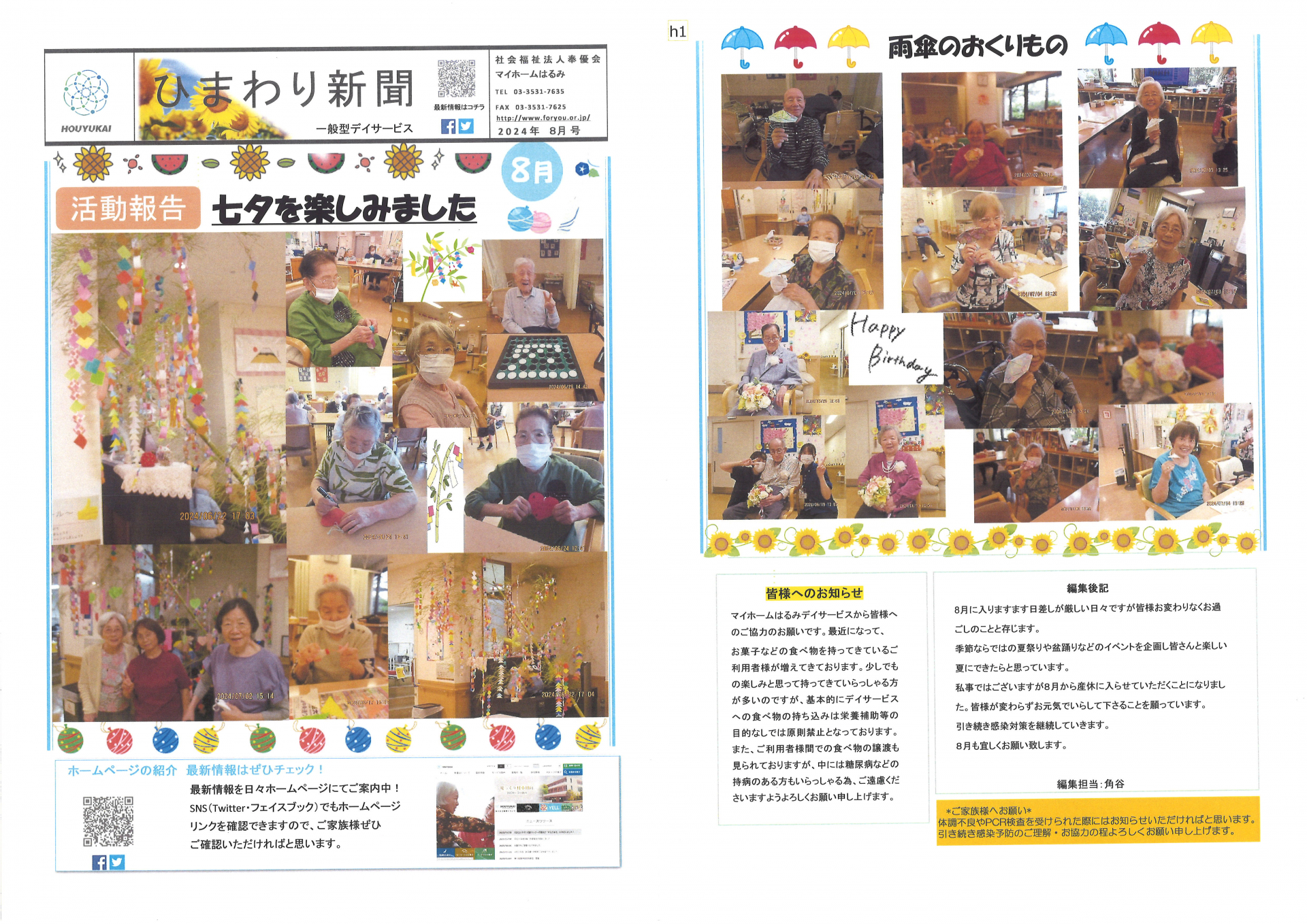 2024.07.17 活動報告 【はるみデイ】8月広報 Tweet シェアする 8月の広報紙です。 7月に七夕を楽しんだご様子を掲載しました。 良い夏になるといいなと思います♪ はるみデイ 角谷 前の記事 2024.07.17 活動報告 【はるみデイ】ホリデーの新しいご利用者様 次の記事 2024.07.07 活動報告 七夕盛り上がりました! 一覧へ戻る
