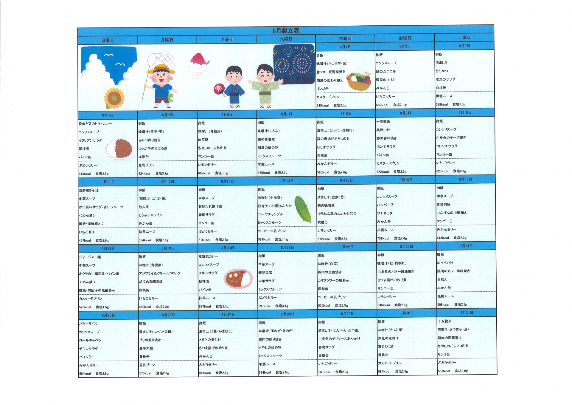 2024.07.19 活動報告 【はるみデイ】8月広報 Tweet シェアする 8月の献立です。 おやつの形態がどなたでも食べやすいプリンやゼリーに統一されました。 水分補給も忘れずに夏を乗り切りましょう。 はるみデイ 角谷 前の記事 2024.07.20 活動報告 カワイ子ちゃんいらっしゃいました♪ 次の記事 2024.07.18 活動報告 踊りの先生が来てくれました! 一覧へ戻る