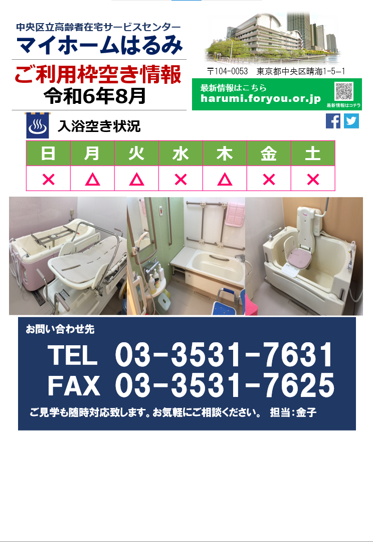 2024.08.28 活動報告 入浴空き状況 Tweet シェアする 8月入浴空き状況を更新しました! はるみデイサービス:橋本 前の記事 2024.08.28 活動報告 入浴職員へ空調服を導入しました! 次の記事 2024.08.28 活動報告 8月空き情報 一覧へ戻る