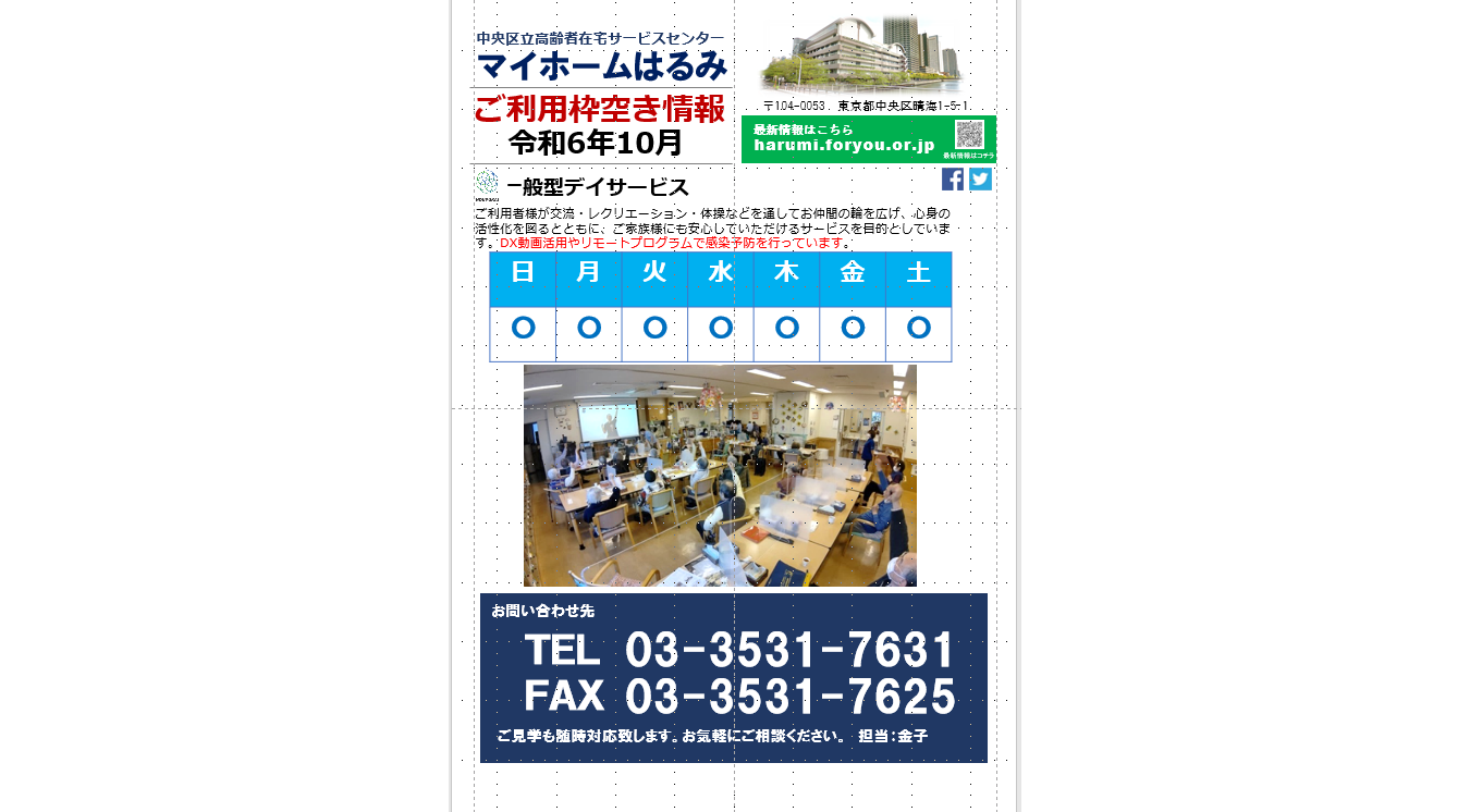 2024.09.30 活動報告(IN) 空き状況を更新しました Tweet シェアする 空き状況を更新しました。 マイホームはるみデイサービス:橋本 前の記事 2024.09.30 活動報告(IN) 入浴空き状況を更新しました 次の記事 2024.09.26 活動報告(IN) 歌のボランティアの皆さんが来てくれました! 一覧へ戻る