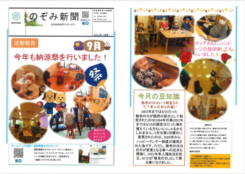 2025.09.15 敬老の日 活動報告 2025.09.15 踊りの会 活動報告 2025.09.14 歯について知ろう 活動報告 2025.09.12 膝の筋肉を鍛えて立ち上がり上手 活動報告 2025.09.09 重陽の節句 活動報告 2025.09.05 音楽ボランティアのナガトさん 活動報告 2025.09.03 セラピードッグ 活動報告 2025.09.01 習字 活動報告 2025.08.30 月を作ろう! 活動報告 2025.08.27 踊りの会 活動報告 2025.08.23 9月ののぞみ新聞 活動報告 2025.08.23 9月の献立 活動報告 2025.08.22 下腿三頭筋の筋力トレーニング 活動報告(IN) 2025.08.21 コスモスを作ろう! 活動報告 2025.08.20 ドッグセラピー 活動報告 1 2 3 4 … 29