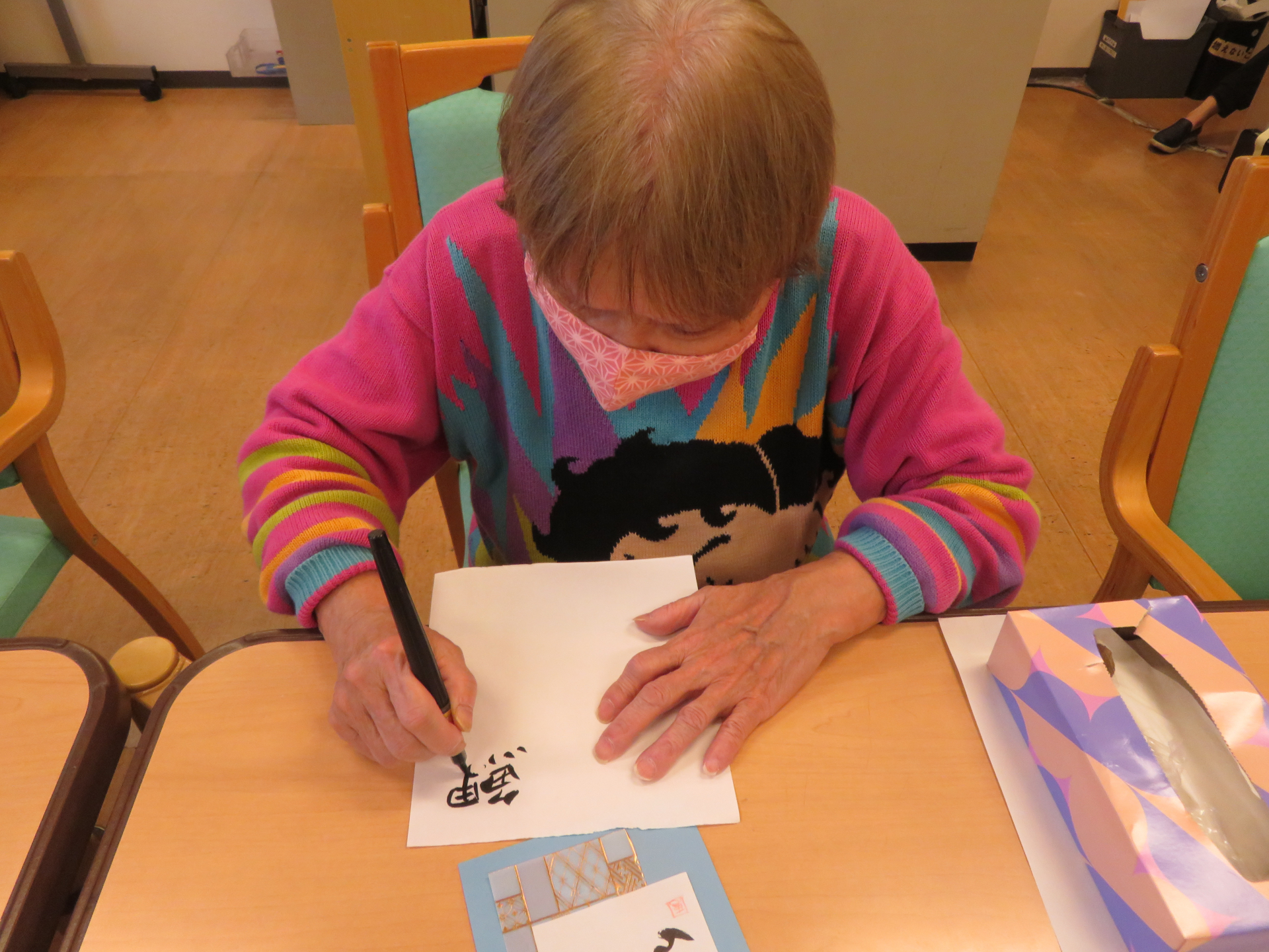復帰するのは臨床美術の資格を持つ職員なので、また美術のレクが再開になります。お楽しみに!!