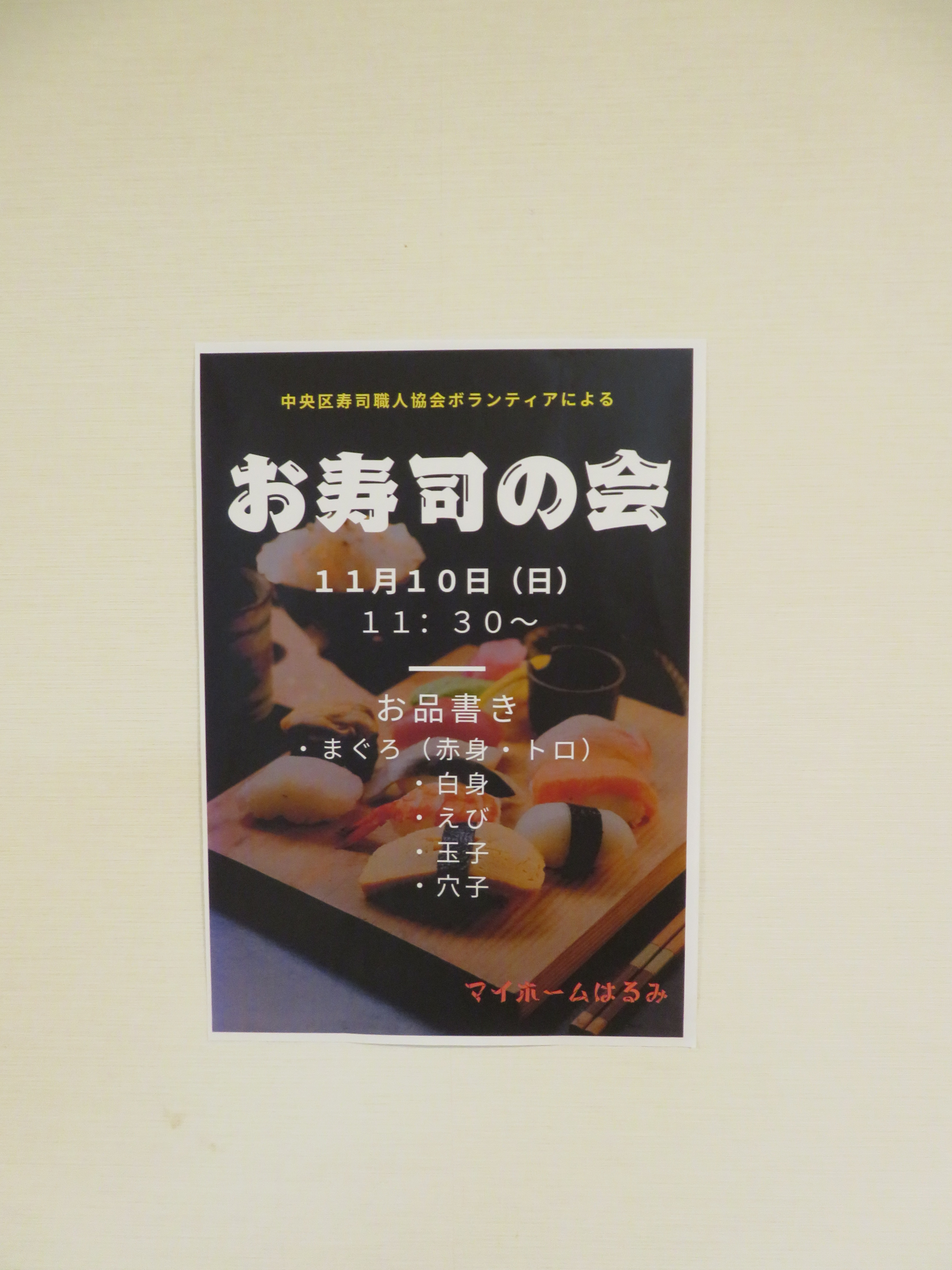 来月11月10日、日曜日11:30~寿司職人のボランティアさんにお越し頂き、お寿司の会を開きます。