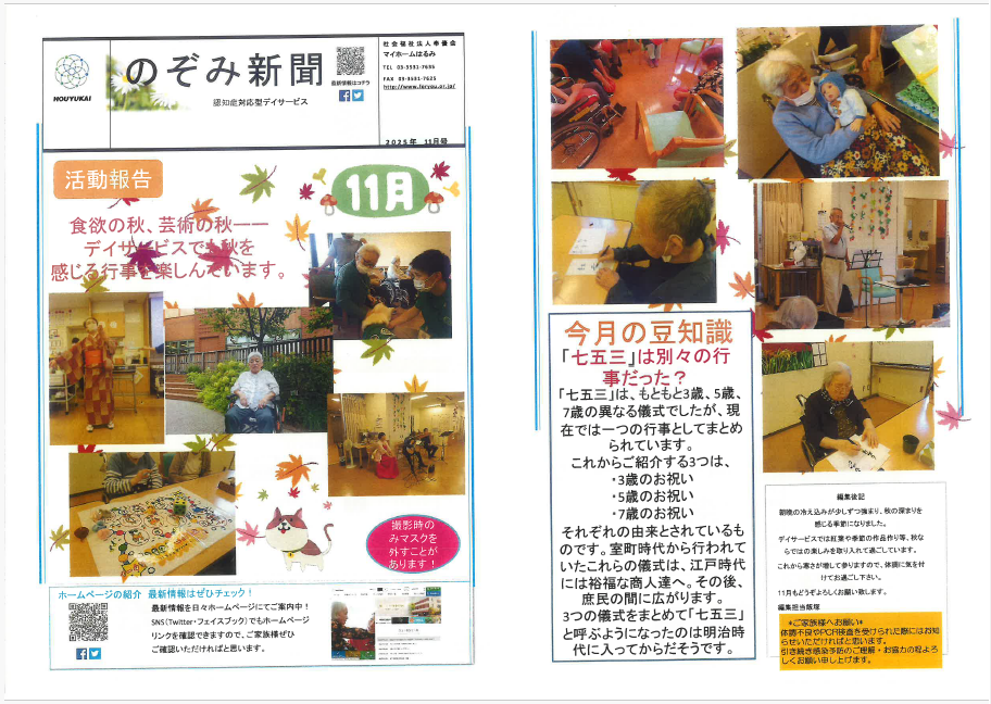 2025.10.22 活動報告 11月の新聞 Tweet シェアする 11月の新聞ができました。 是非ご一読下さい。 マイホームはるみ認知デイ 飯塚 前の記事 2025.10.22 活動報告 セラピードッグ 次の記事 2025.10.22 活動報告 11月の献立 一覧へ戻る