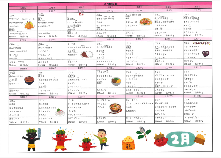 節分やバレンタインデー等に因んだ行事食や、旬の食材を取り入れたメニュー等、見た目にも楽しんで頂ける内容