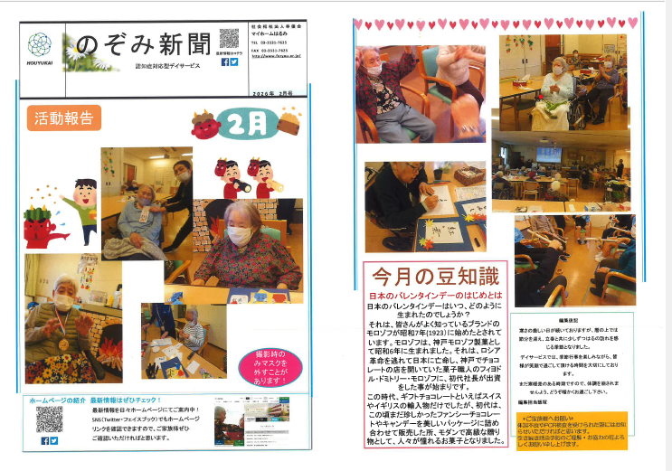 2026.01.14 活動報告 2月の新聞ができました。 Tweet シェアする デイサービス2月号の新聞ができました。 今月の行事や日々のご様子等を掲載しておりますので、ぜひご覧下さい。 マイホームはるみ認知デイ 飯塚 前の記事 2026.01.14 活動報告 大橋さん 次の記事 2026.01.14 活動報告 ドッグセラピー 一覧へ戻る