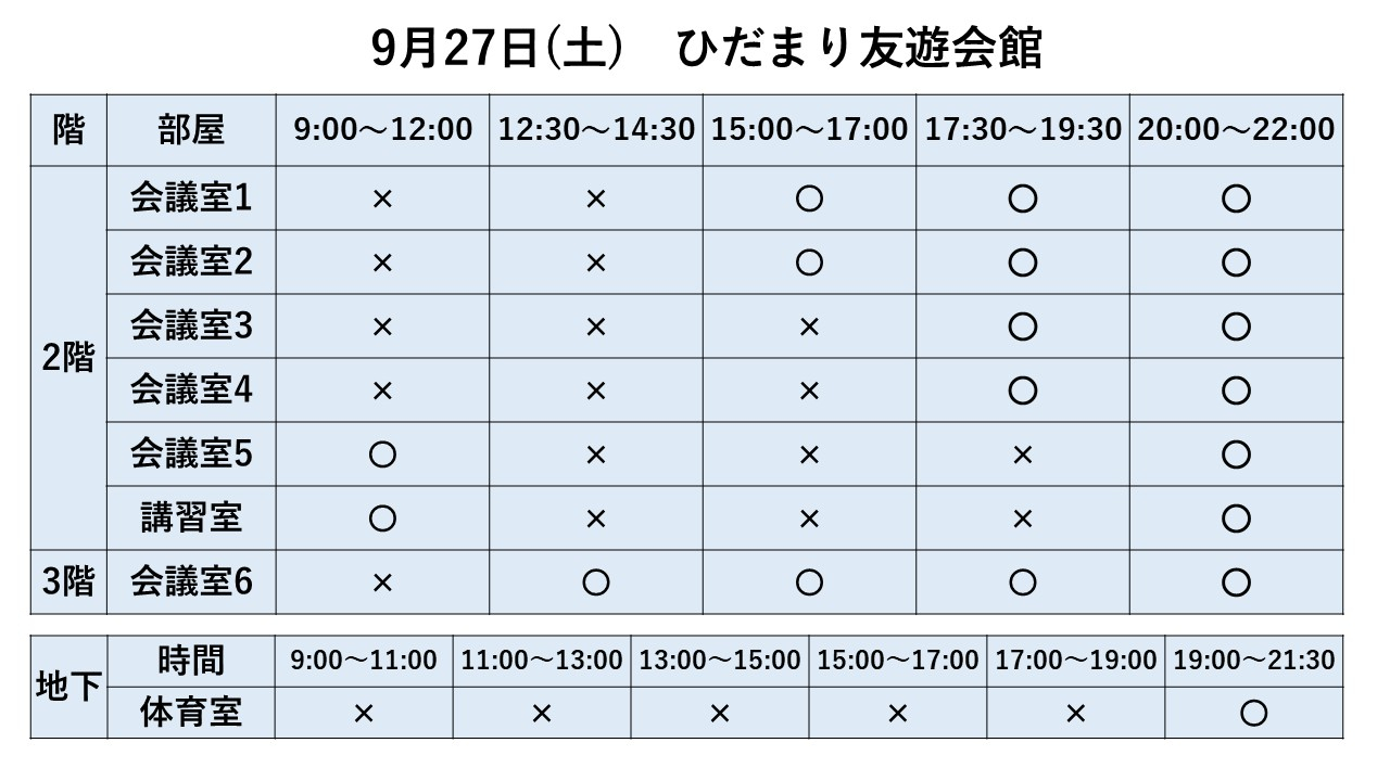 2025.07.31 お知らせ 9/21~9/27利用状況 Tweet シェアする 9/21~9/27までの利用状況です。※9/13現在 ※最新情報はお電話でお問い合わせください。 9/14(日)に敬老行事開催のため9/21(日)が休館日となります。 ひだまり友遊会館 前の記事 2025.07.31 お知らせ 9/28~9/30利用状況 次の記事 2025.07.31 お知らせ 9/14~9/20利用状況 一覧へ戻る