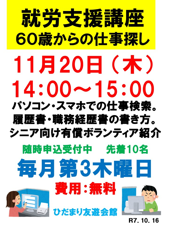 2025.10.17 お知らせ 就労支援講座やっています Tweet シェアする 就労支援講座を開催します 60歳からの仕事探しをお手伝いします ひだまり友遊会館 H.T 前の記事 2025.10.17 お知らせ 健康体操☆ 次の記事 2025.10.16 お知らせ 詩吟教室 一覧へ戻る