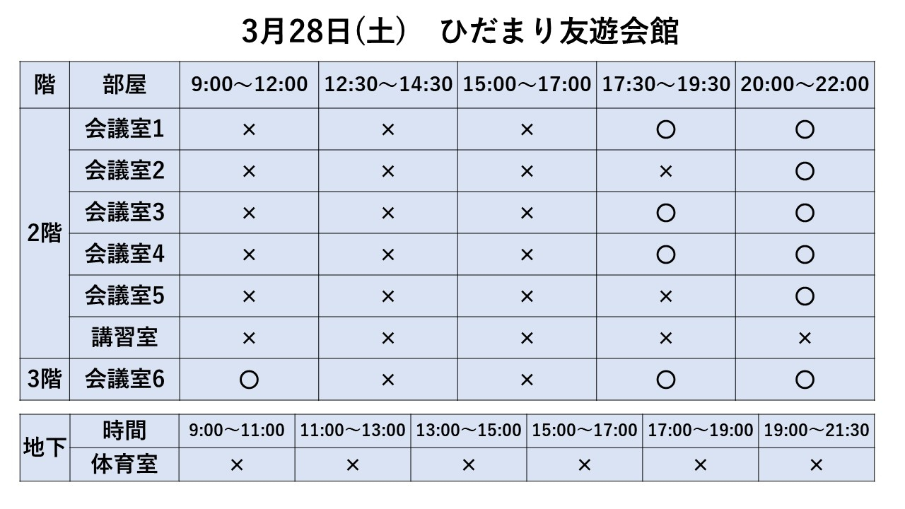 2026.02.01 お知らせ 3/22~3/31利用状況 Tweet シェアする 3/22~3/31までの利用状況です ※3/20現在 ※最新情報はお電話でお問合せ下さい ひだまり友遊会館 寺﨑 前の記事 2026.02.06 お知らせ ひだまり健康体操 次の記事 2026.02.01 お知らせ 3/15~3/21利用状況 一覧へ戻る