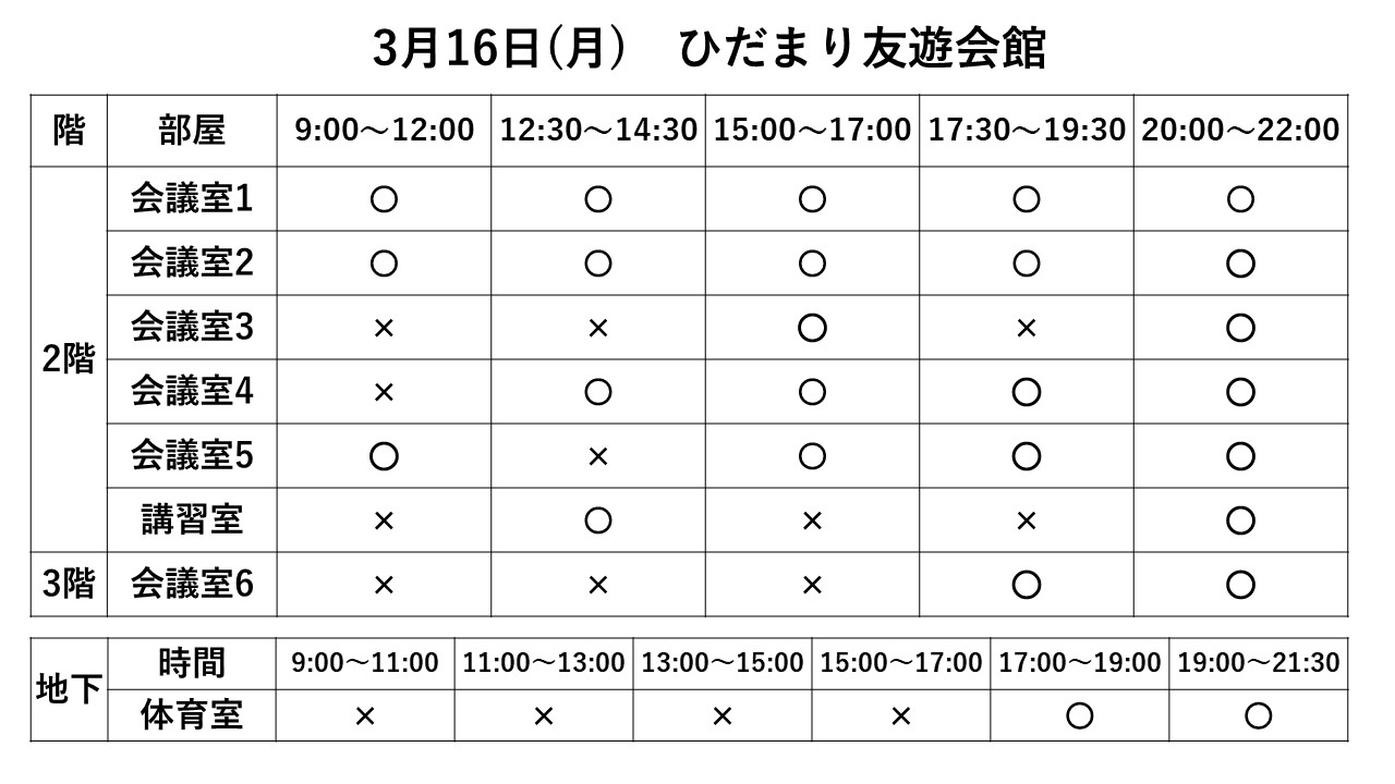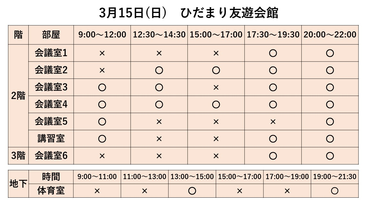 2026.02.01 お知らせ 3/15~3/21利用状況 Tweet シェアする 3/15~3/21までの利用状況です ※3/12現在 ※最新情報はお電話でお問合せ下さい 前の記事 2026.02.01 お知らせ 3/22~3/31利用状況 次の記事 2026.02.01 お知らせ 3/8~3/14利用状況 一覧へ戻る