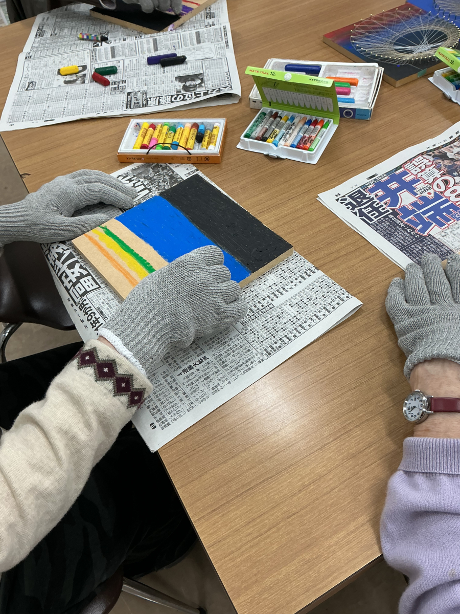 クレヨンで板に色を塗り、ティッシュや軍手を使ってこすりグラデーションにしていきます。