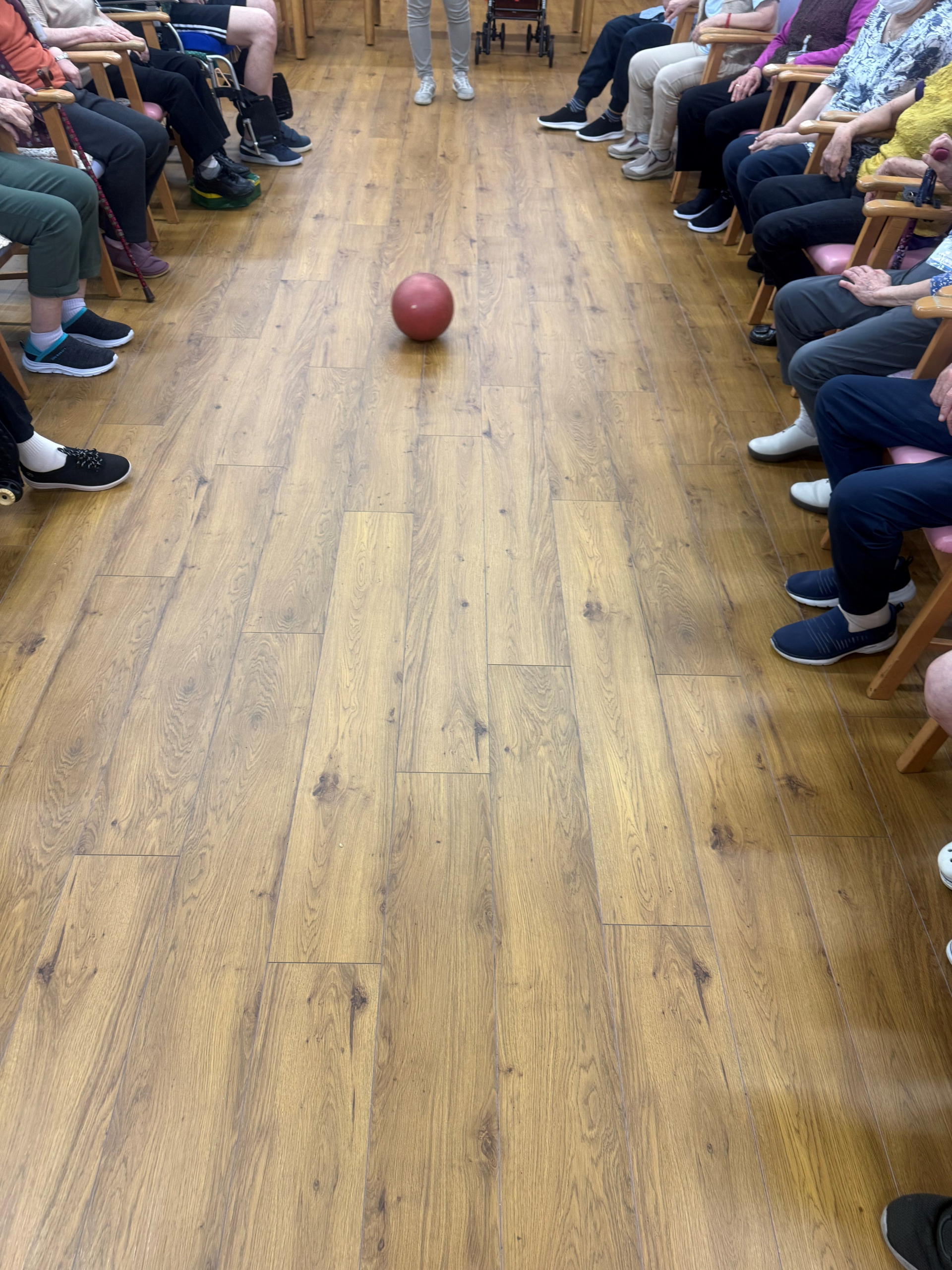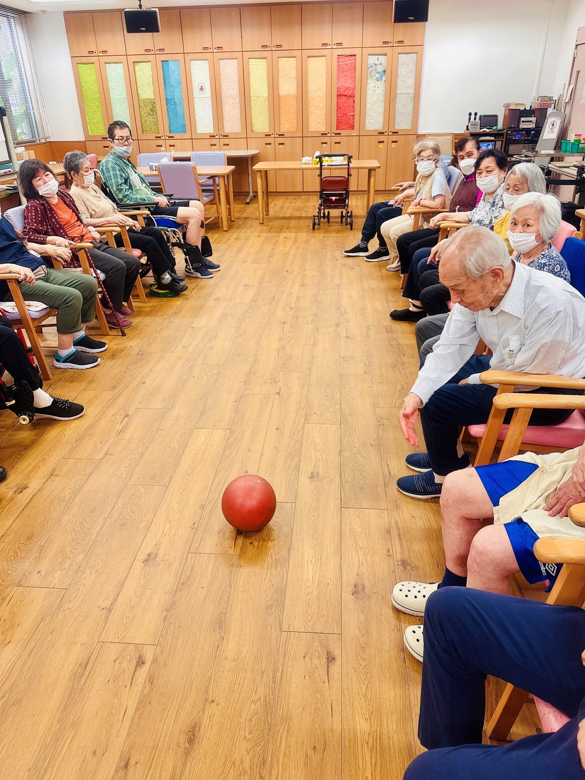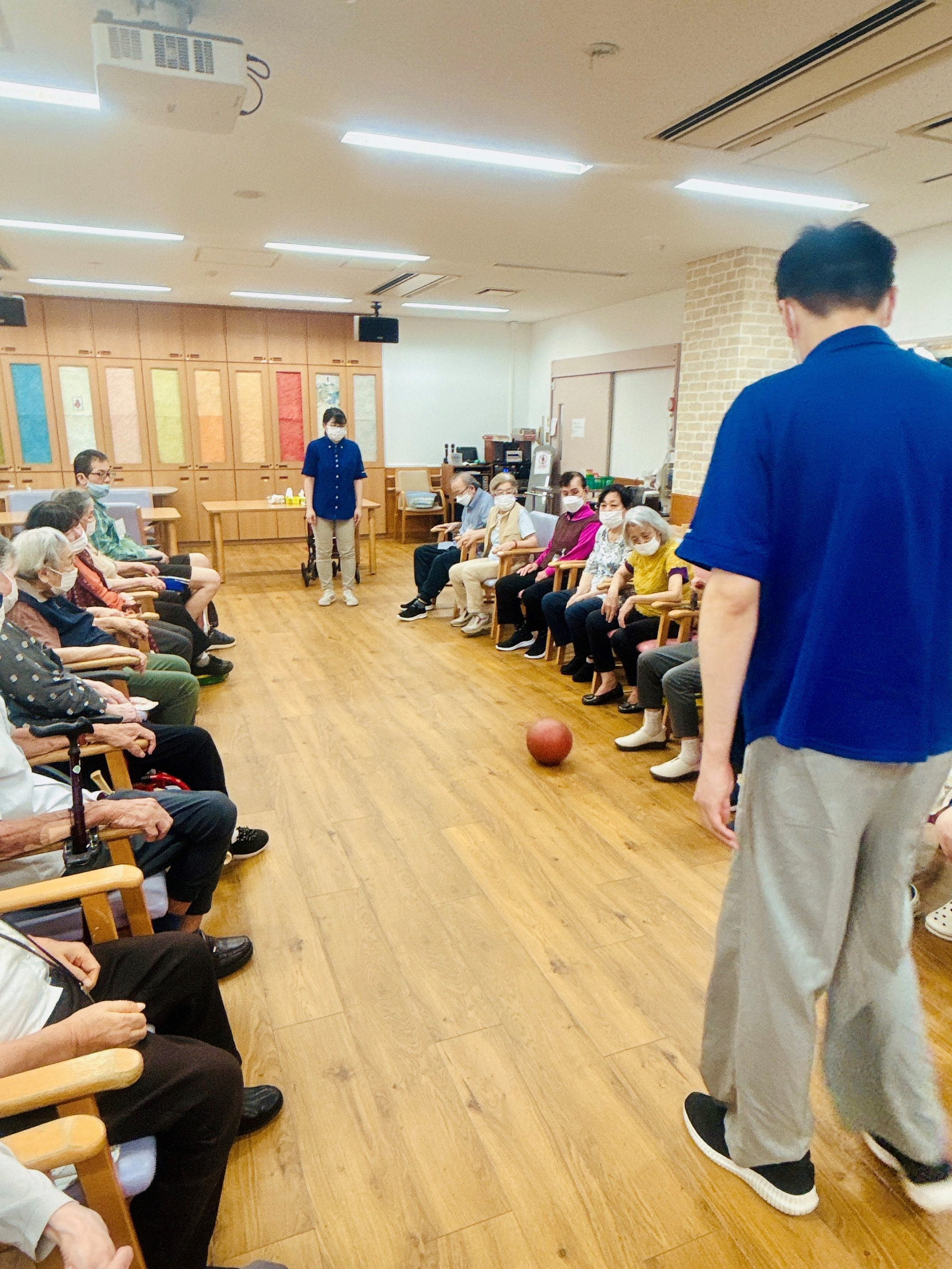 今日は「ボール飛ばしゲーム」で、足の運動を兼ねてお楽しみいただきました。足でボールを蹴って、カゴの中に上手くボールを入れます。普段とは違う足の動きをしますが、皆さま意外と上手にされていました。