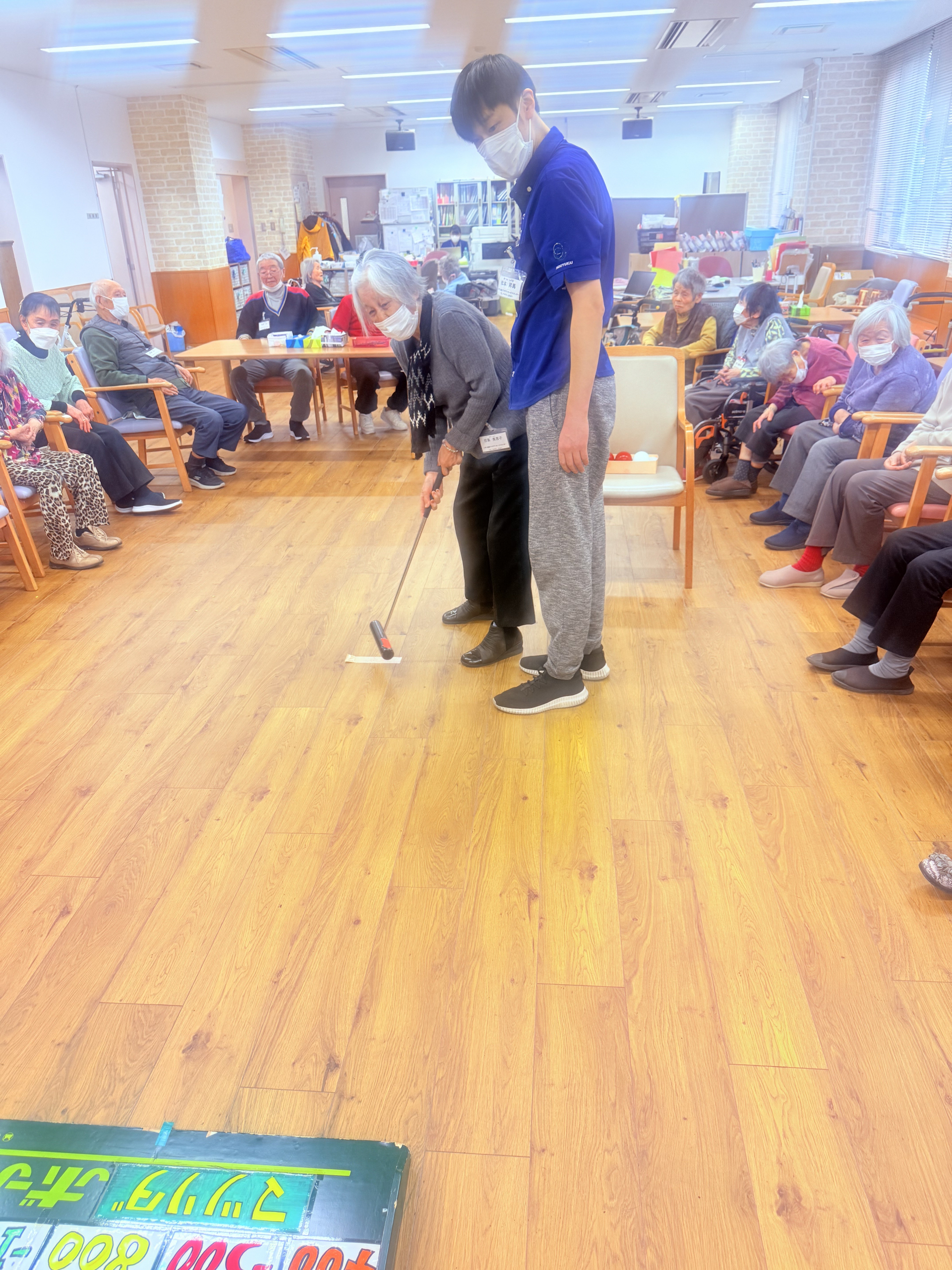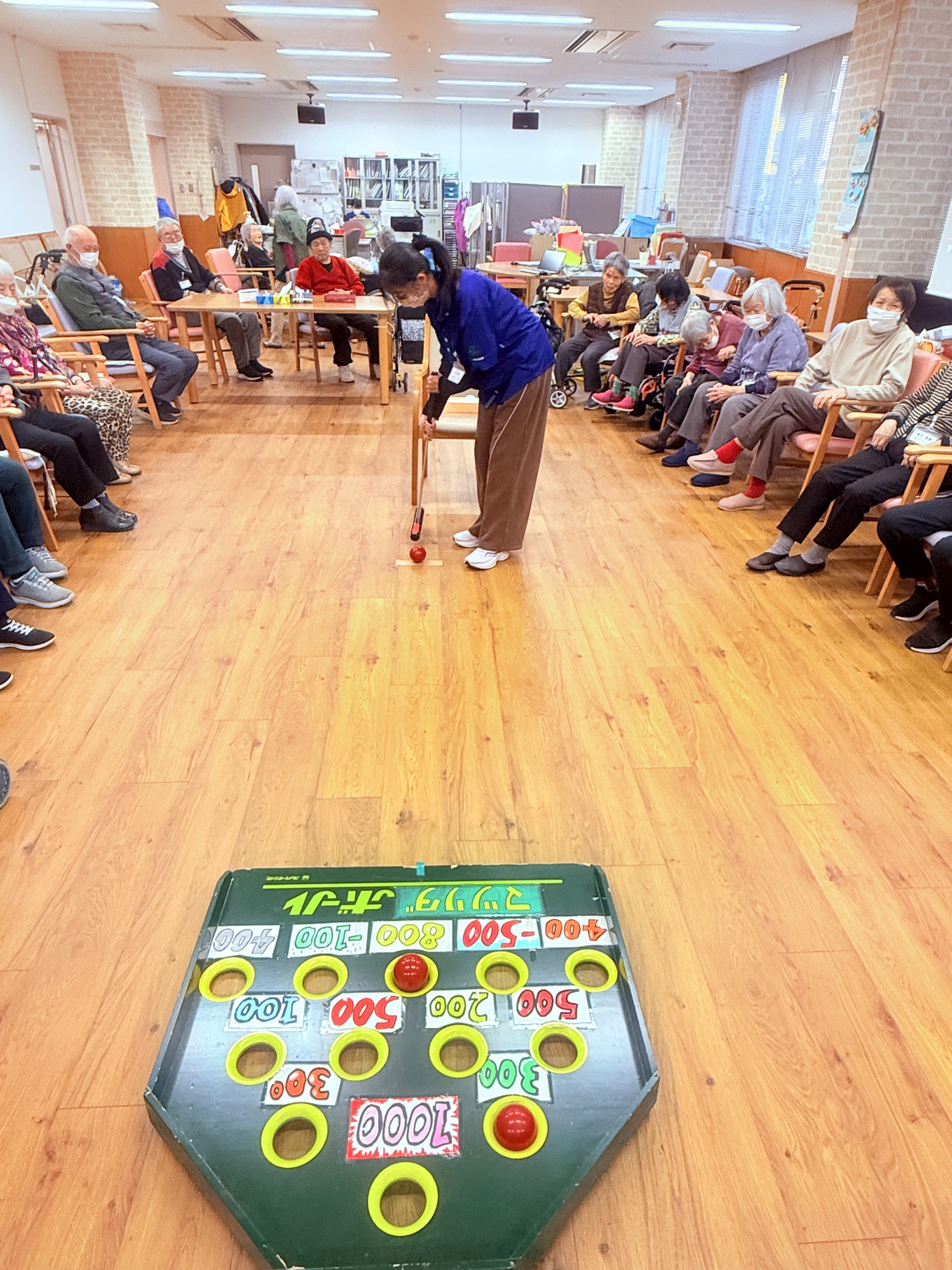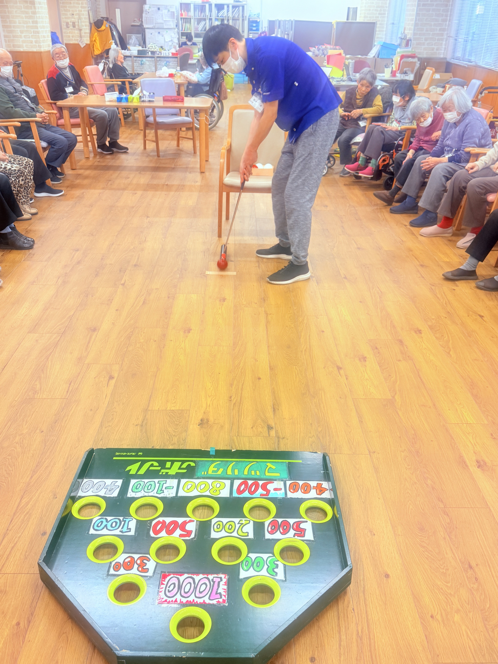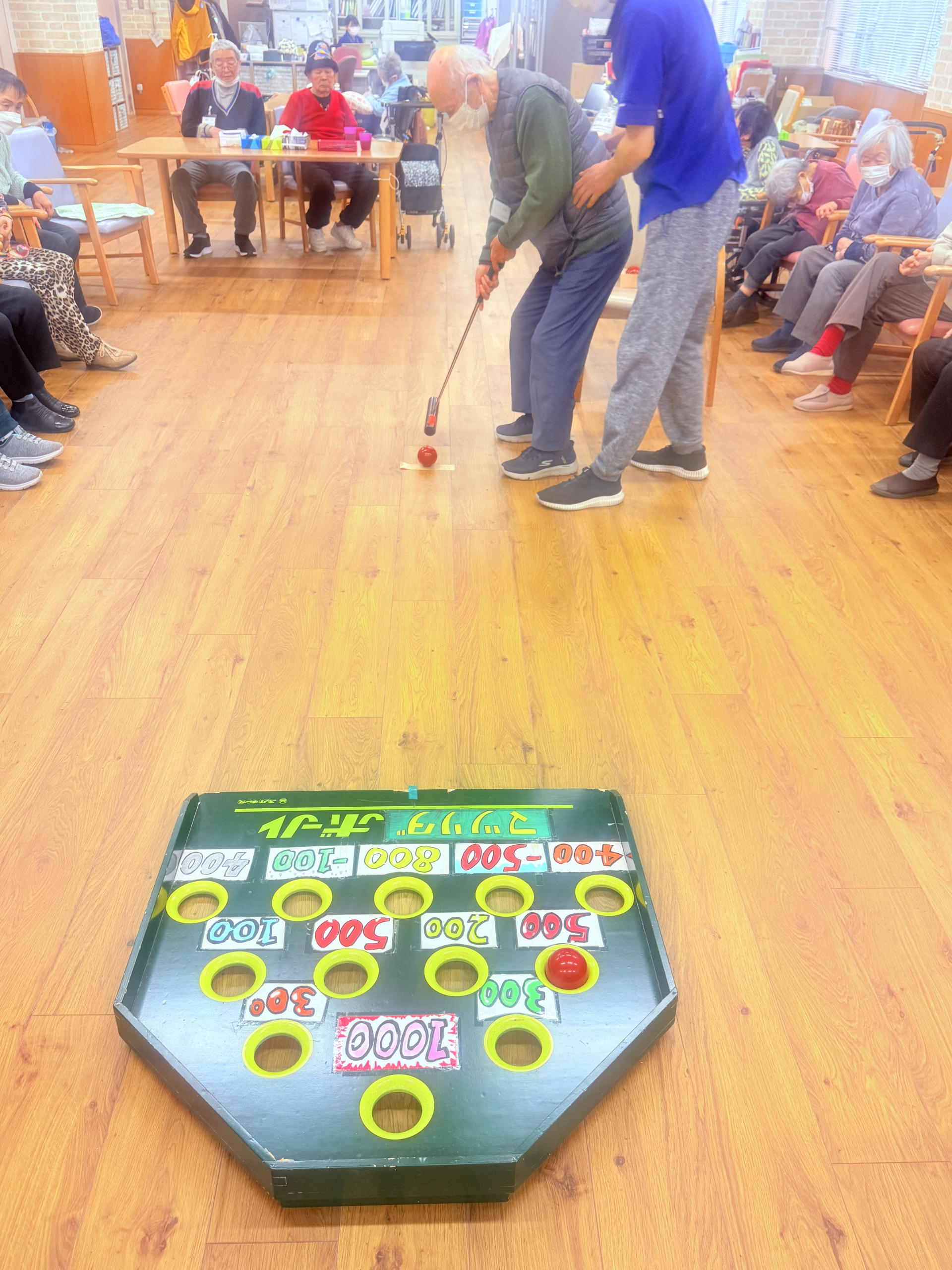 本日はご利用者様がパターゴルフゲームを実施しました。ボールを転がして点数が書いてある箇所に入れるゲームです。狙った所に入れることは、難しい様子でした。点数が入ると盛り上がっておりました。皆様の声援により盛り上がりました。
