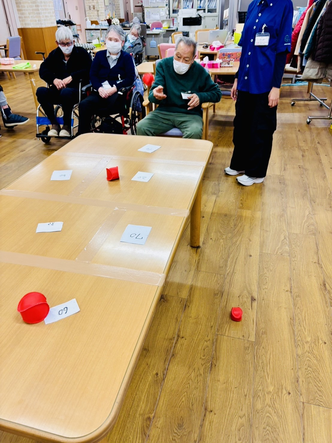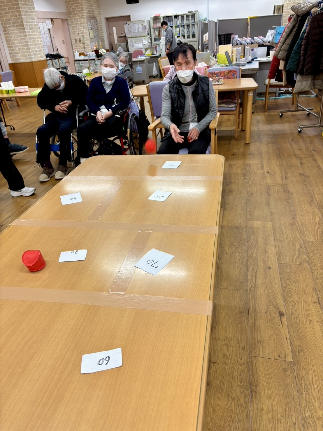 2026.01.07 活動報告 ゲーム(テーブルのせ) Tweet シェアする 本日はテーブルのせゲームに取り組まれております。小さなボールを投げて、得点が書いてある所に乗せるゲームです。高得点になるように皆さん頑張りました。 ひがしデイのゴーテイモ 前の記事 2026.01.07 活動報告 初詣 次の記事 2026.01.06 活動報告 ゲーム(ミニサッカー) 一覧へ戻る