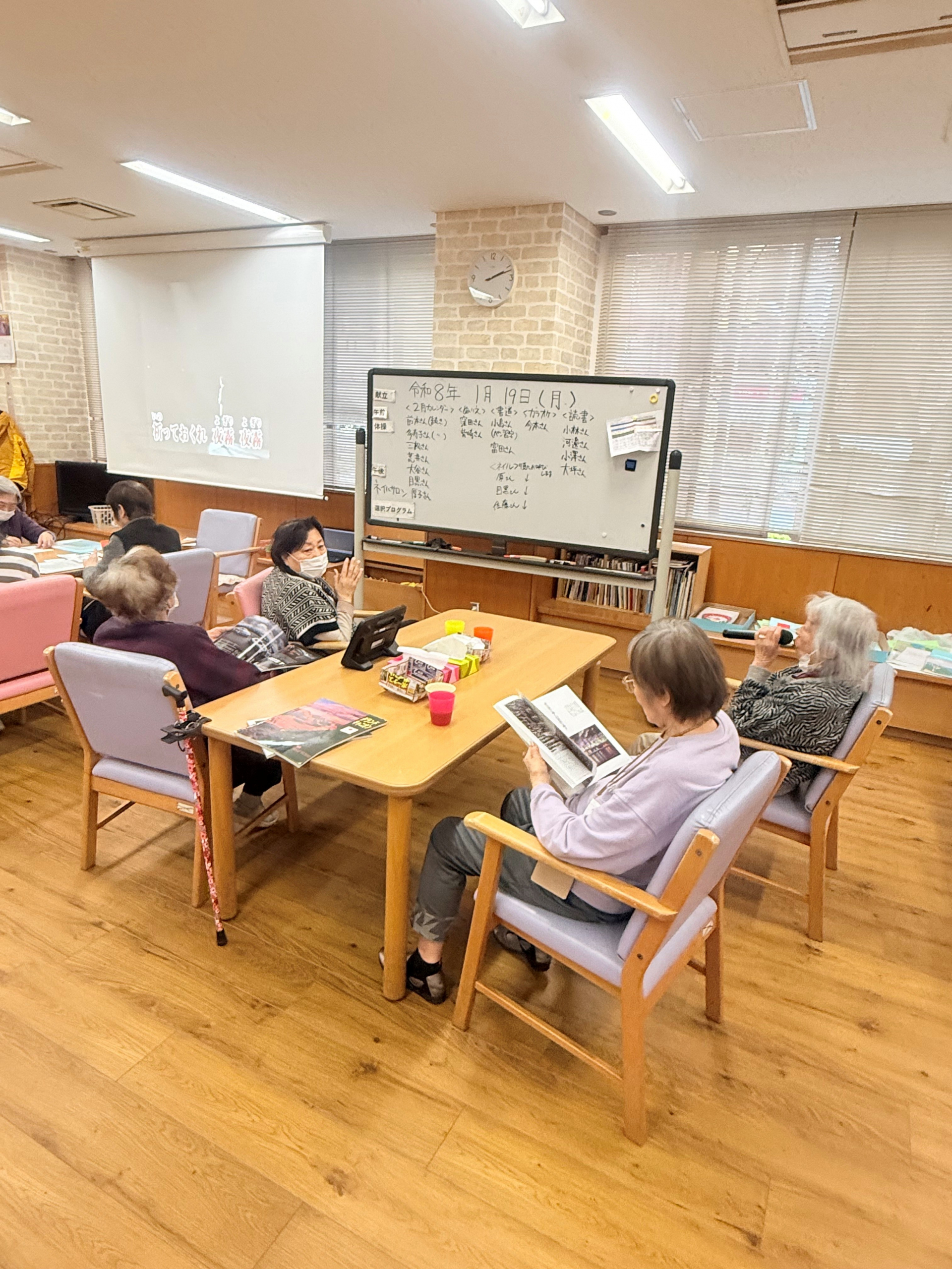 2026.01.19 活動報告 選択プログラム Tweet シェアする 今日は「選択プログラム」でいつものように、2月のカレンダー作り、カラオケ、書道、将棋、読書の中からお好きな活動を選んで取り組んでいただきました。 ひがしデイのゴーティモ 前の記事 2026.01.20 活動報告 福笑いゲーム 次の記事 2026.01.19 活動報告 ネイルサロン 一覧へ戻る