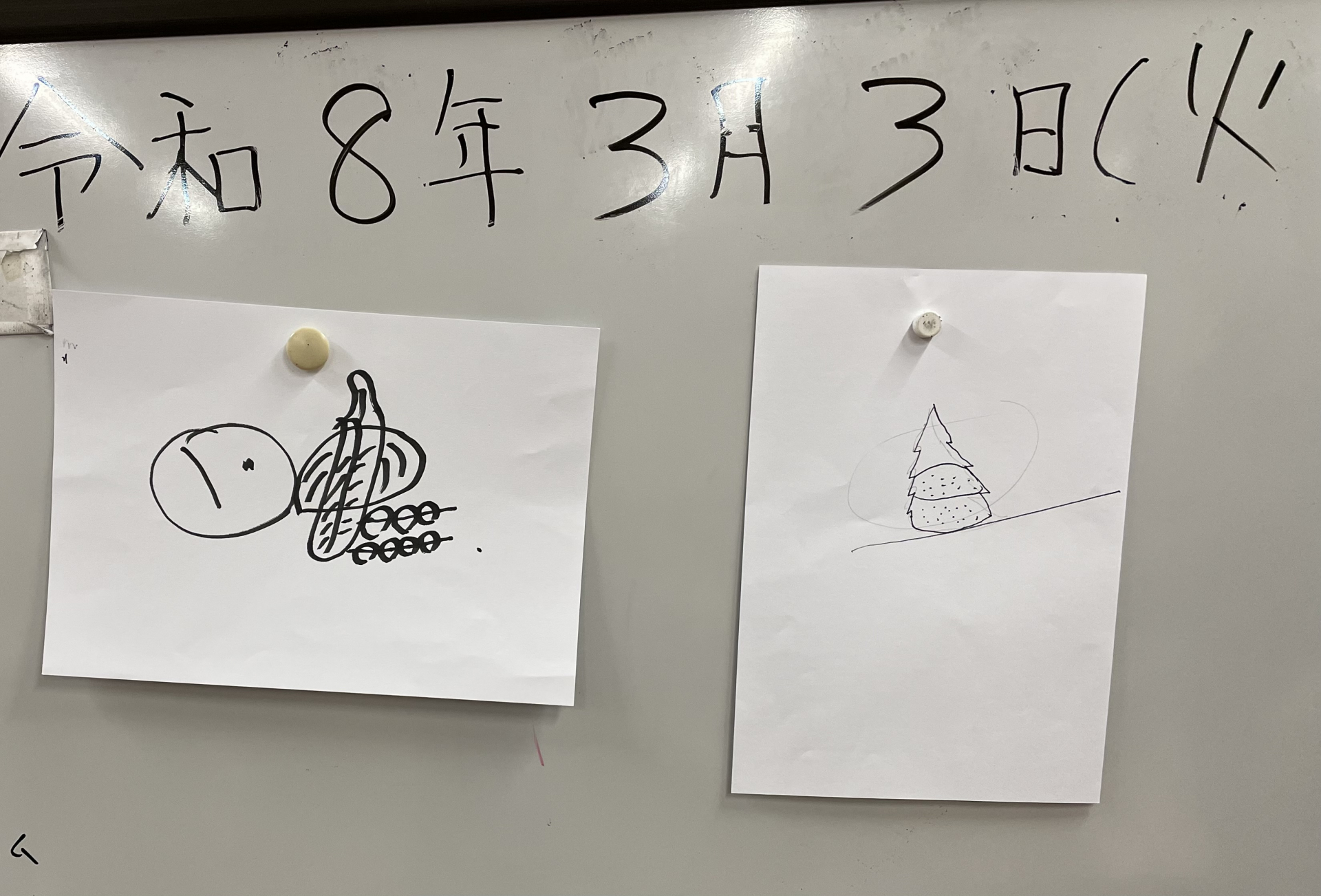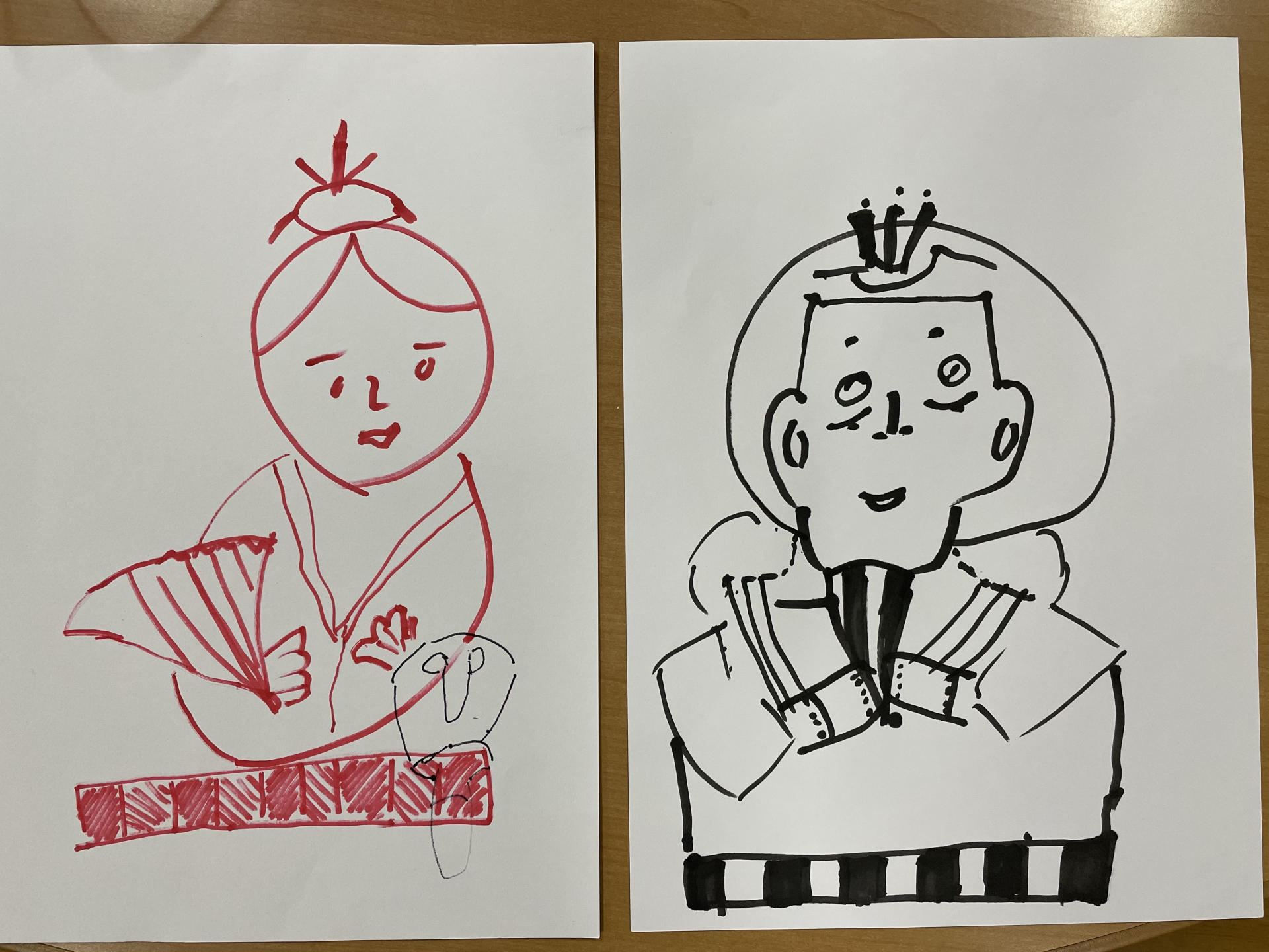 ひな祭りにちなんだ、桜餅、お内裏様とお雛様をチーム対抗で、みんなで少しずつ描いて完成させるというものです。