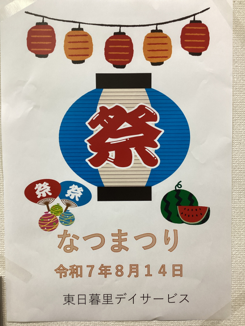 2025.08.13 【東日暮里デイ】明日はなつまつり♪ 活動報告 2025.08.12 【東日暮里デイ】9月のカレンダー作り 活動報告 2025.08.11 【東日暮里デイ】余暇時間 活動報告 2025.08.07 今月の書道は夏らしく! 活動報告 2025.08.04 【東日暮里デイ】午後のレクレーションは!? 活動報告 #デイサービス #レクリエーション #デイ #東日暮里サービスセンター 2025.08.02 【東日暮里デイ】8月のプログラム予定表 活動報告 #デイサービス #イベント #レクリエーション #東日暮里サービスセンター #ゲーム 2025.08.02 昭和カルタ 活動報告 2025.08.02 【東日暮里デイ】献立表 活動報告 #デイサービス #デイ #お食事 #行事食 #食事 #東日暮里サービスセンター 2025.08.01 暖~DAN~8月号 お知らせ 2025.07.31 ウナギイベント 活動報告 2025.07.26 書写 活動報告 2025.07.26 今日も皆さまの力でタオルがきれいに整いました 活動報告 2025.07.25 誕生日会 活動報告 2025.07.23 【東日暮里デイ】カラオケ 活動報告 2025.07.22 【東日暮里デイ】麻雀! 活動報告 1 2 3 4 5 … 22