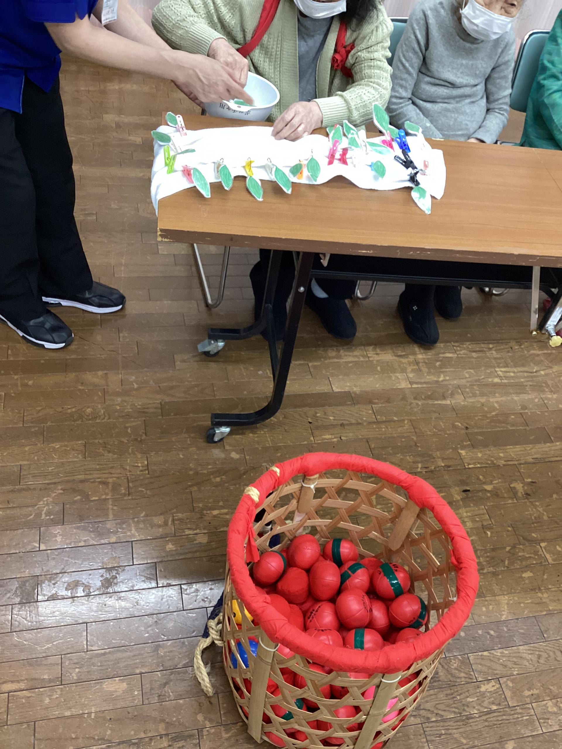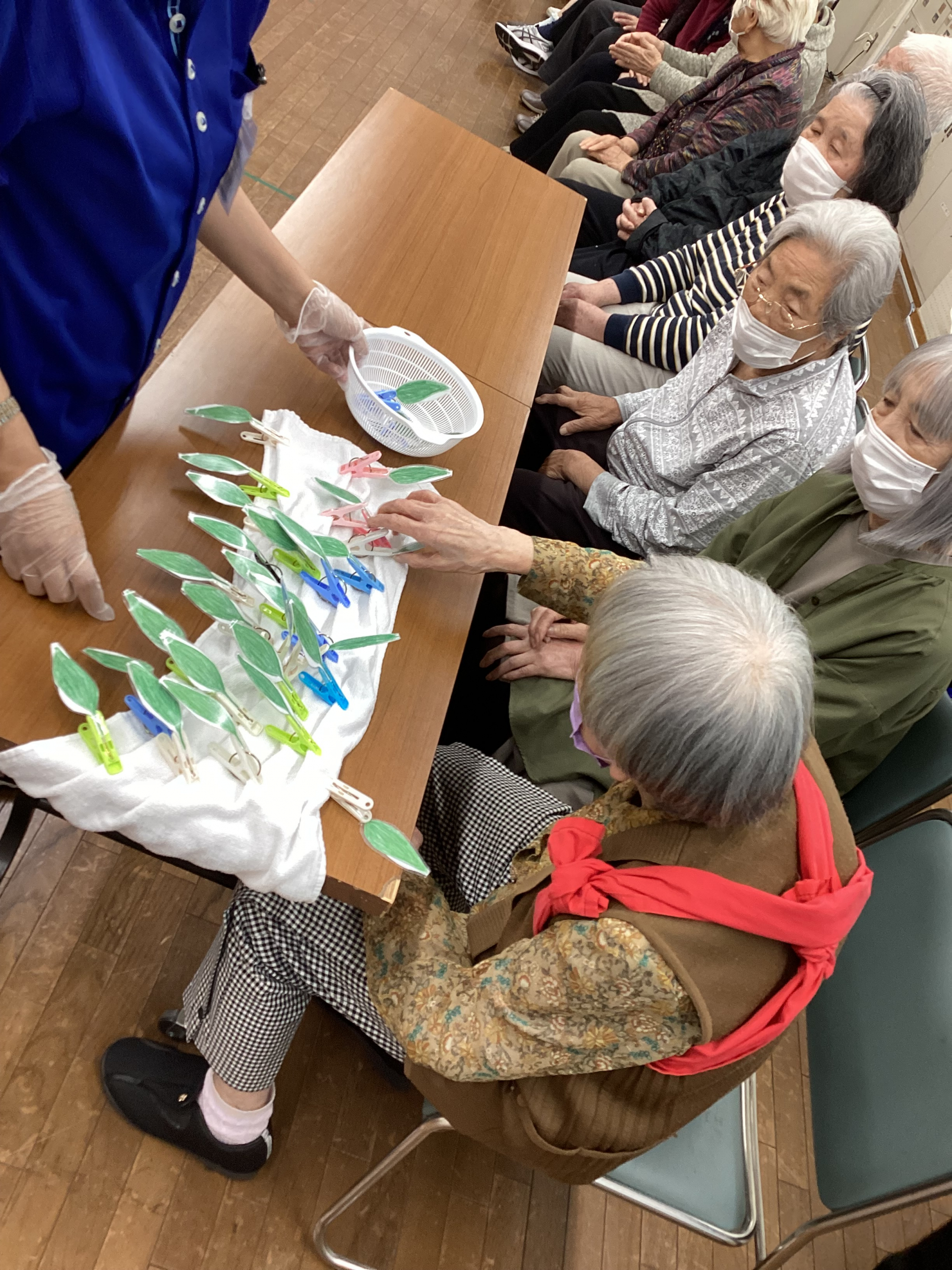 2チームに分かれ、🍃を洗濯ばさみ^でタオルに留めていき茶摘みの音楽の