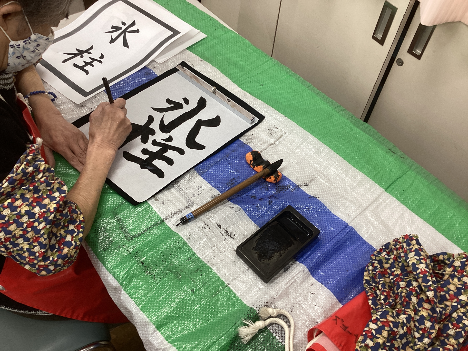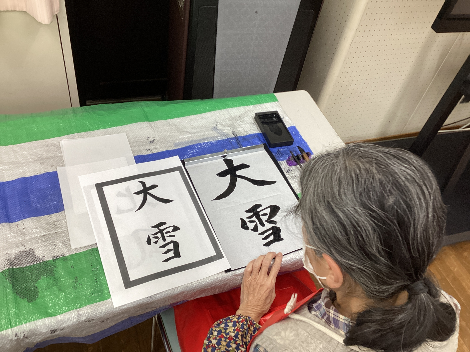 今月の書道は「氷柱」「南天」「北風」「大雪(たいせつ)」を題材に取り組んでいただきました。冬らしい言葉に触れながら、筆を運ぶたびにその静かな美しさや季節の深まりを感じていただけたように思います。皆さま集中しつつも、「難しいね」「きれいに書けるかな」と声を掛け合い、和やかな雰囲気の中でゆったりとしたあたたかい時間が流れていました。