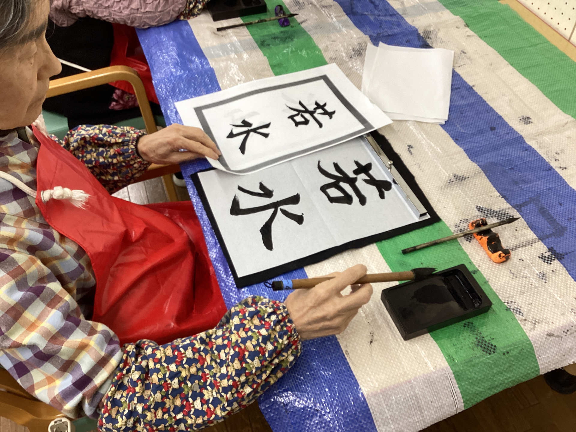 書き終えた後は、お互いの作品を眺めながら「きれいね」「いい字だね」と自然と会話も弾み、穏やかな時間となりました。