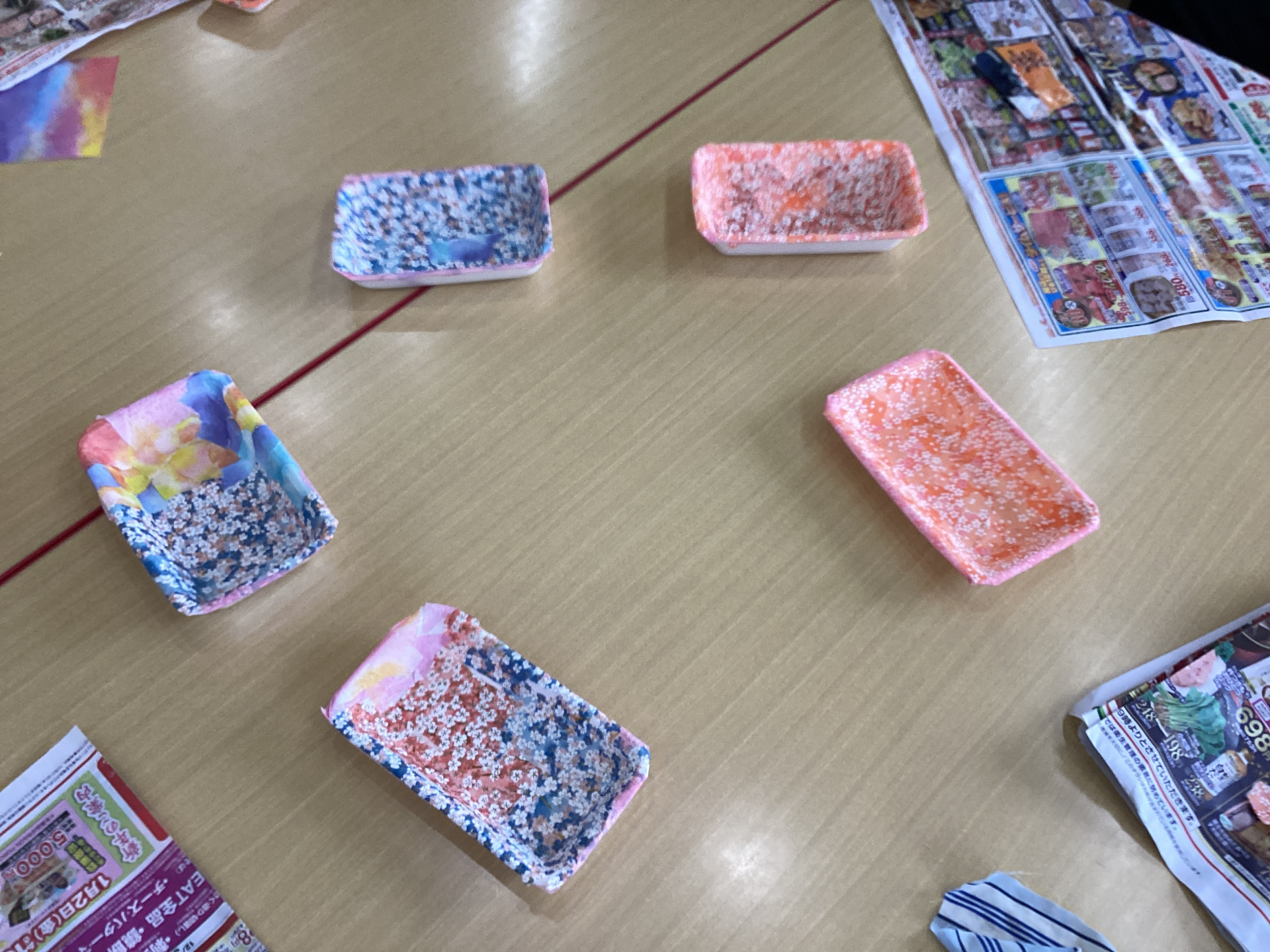 お肉などが入っていたトレーを再利用し、和紙や和紙柄の折り紙を手でちぎって、糊で丁寧に貼り重ねていきました。細かくちぎる方、大きめに大胆に貼る方など、それぞれの個性が光る作品に仕上がっています。