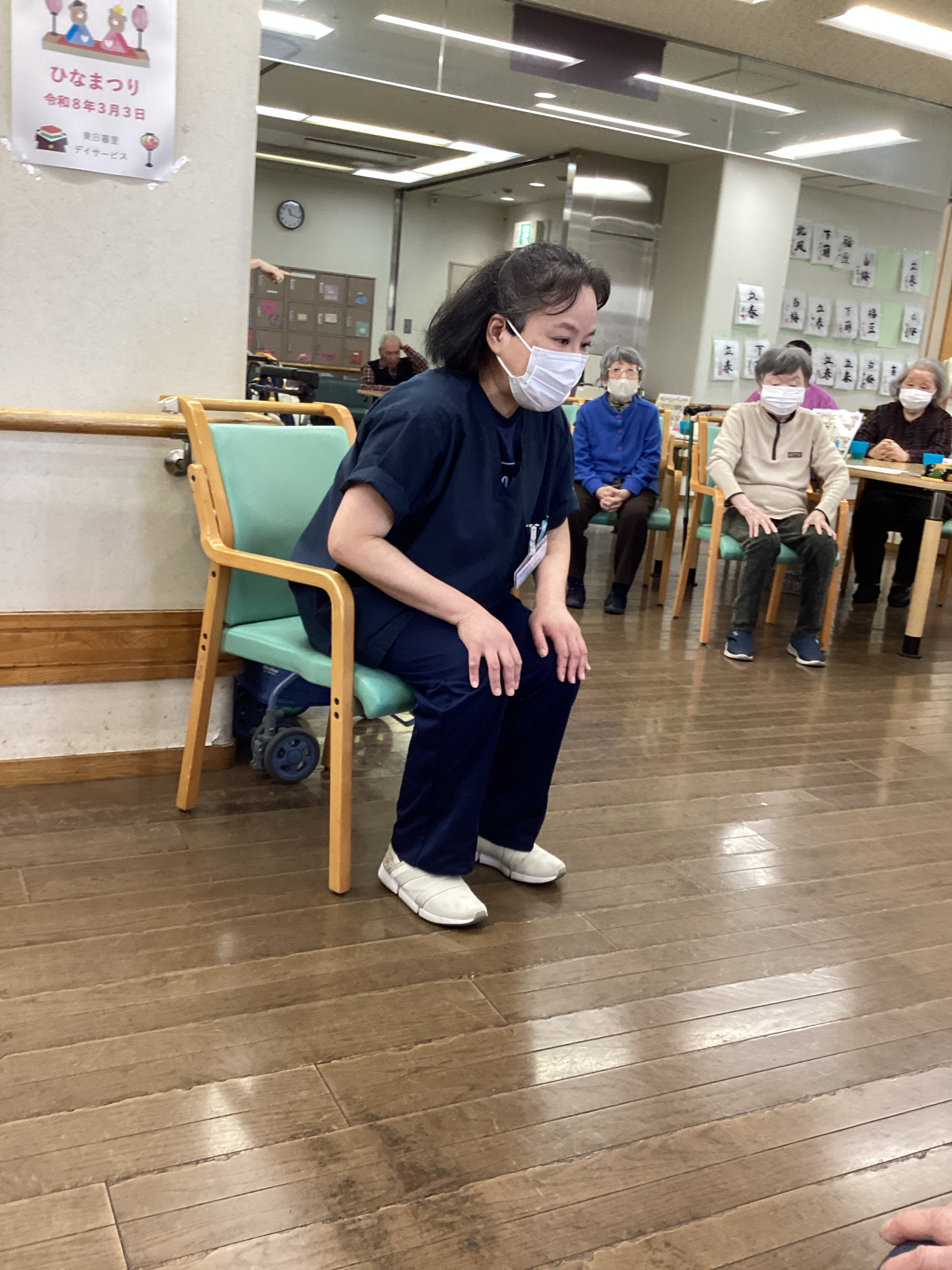 今日の体操も、やさしい口調で「はい、もう少しだけがんばりましょうね」と、にこやかに声をかけてくださるN PT。