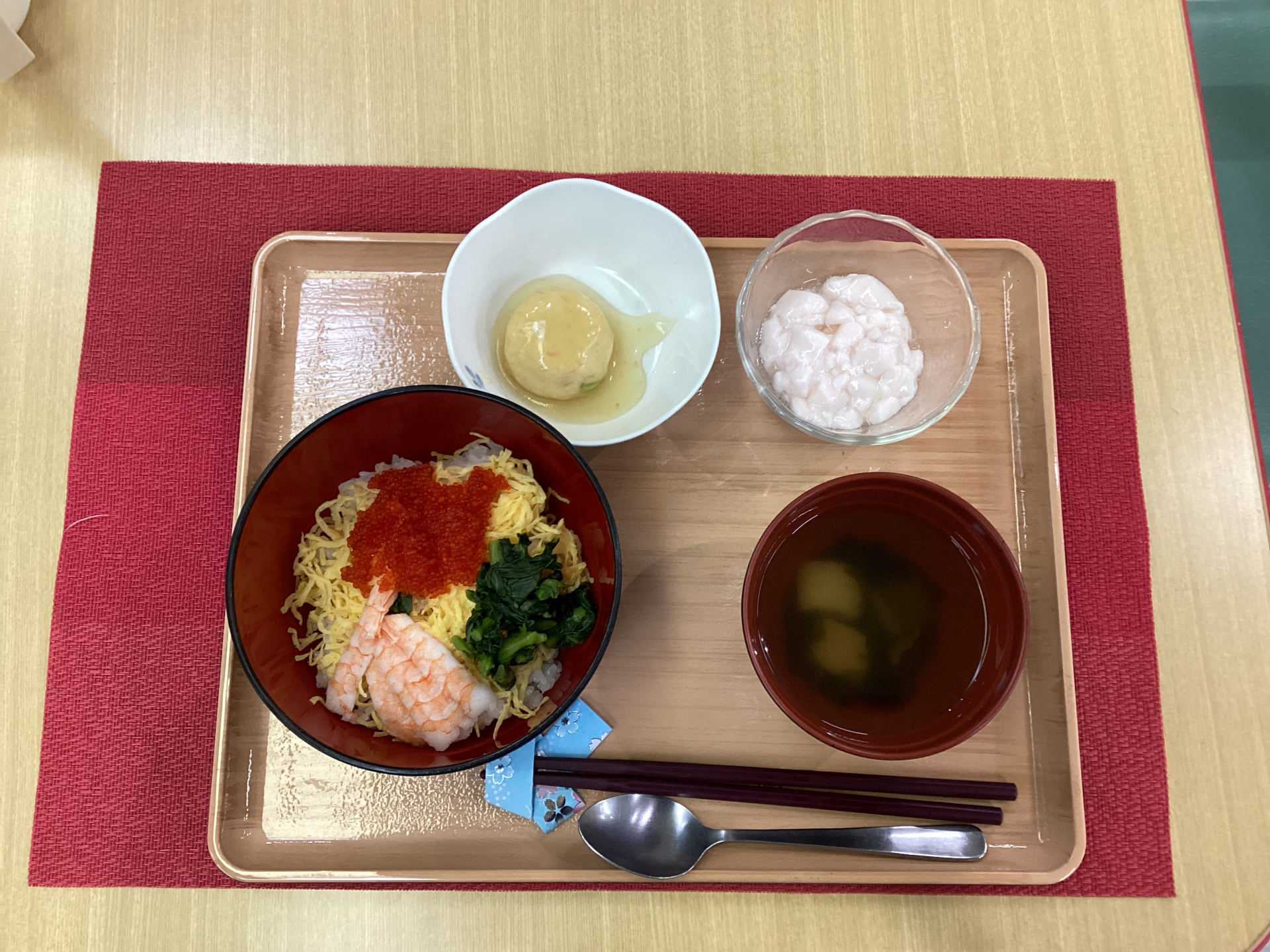 昼食にはちらし寿司を、おやつには桜餅をご用意いたしました。春らしい彩りに、「きれいだね」「おいしいね」と笑顔が見られ、季節を感じていただけたひとときとなりました。