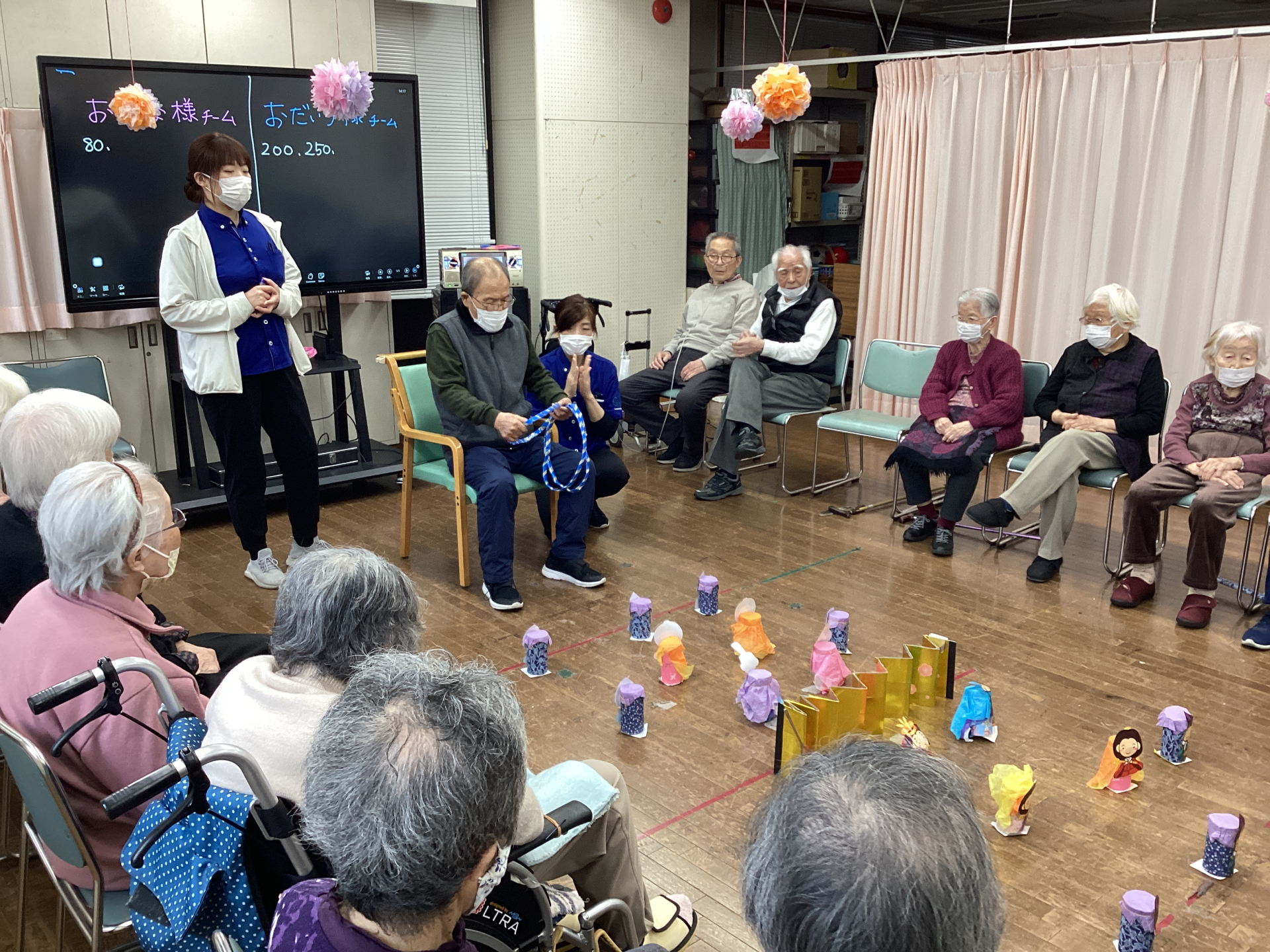 午後は皆さまで「うれしいひなまつり」を歌い、続いておひな様にちなんだゲームも行いました。的を狙ったり、協力し合ったりと、和やかな雰囲気の中で楽しまれていました。