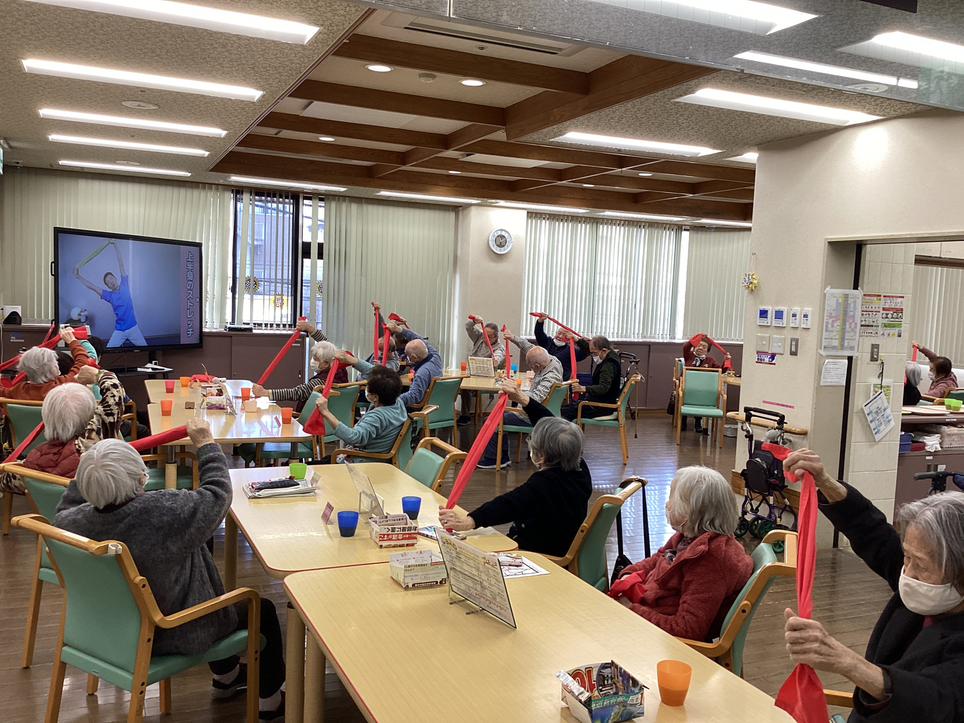 タオルを使うことで動きにメリハリがつき、無理なく全身を動かしていただくことができます。皆様リズムに合わせて取りまれ、和やかな雰囲気の中での実施となりました。楽しく身体を動かす時間となりました。H.O