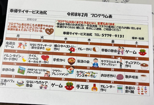 2026.01.31 2月のプログラム表です お知らせ 2026.01.31 音楽に合わせて楽しく体操 活動報告 2026.01.31 デコパージュ 活動報告 2026.01.30 【池尻デイ】★1月のHappyBirthday★ デイサービス #奉優会 #デイサービス #介護 #福祉 #イベント #目黒区 #デイ #世田谷区 #スタッフ 2026.01.30 セラピーパフォーマンス演奏会 活動報告 2026.01.29 極上ぼた餅作り デイサービス 2026.01.27 【池尻デイ】煎餅汁作り‼ デイサービス #奉優会 #デイサービス #レクリエーション #介護 #福祉 #イベント #デイ #目黒区 #楽しい #介護予防 #世田谷区 #お食事 2026.01.26 隙間時間で公園へ 活動報告 2026.01.26 少し早いけど節分気分 活動報告 2026.01.26 今月のカレンダー デイサービス 2026.01.22 カレー 活動報告 2026.01.19 責任者どら焼きを焼く 活動報告 2026.01.17 なないろサロンマッサージ 活動報告 2026.01.13 白玉団子でお汁粉作り 活動報告 2026.01.13 小さなキャンパスにバナナが登場 活動報告 1 2 3 … 64