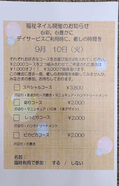 2025.01.11 お汁粉作り デイサービス 2025.01.10 七福神を集めよう! デイサービス 2025.01.09 みんなですごろく デイサービス 2025.01.09 絵馬作り デイサービス 2025.01.09 書初め デイサービス 2025.01.09 海鮮丼を食べよう♪ デイサービス 2025.01.09 ヘアカットのご案内 デイサービス 2025.01.04 運試しは… デイサービス 2025.01.04 世田谷観音へ デイサービス 2025.01.04 新年のご挨拶 デイサービス 2024.12.28 ビンゴ大会♪ デイサービス 2024.12.28 年越しそば デイサービス 2024.12.28 1月フラワーアレンジメントのお知らせ デイサービス 2024.12.28 1月福祉ネイルのお知らせ デイサービス 2024.12.28 1月プログラム表 デイサービス 1 … 29 30 31 32 33 … 61