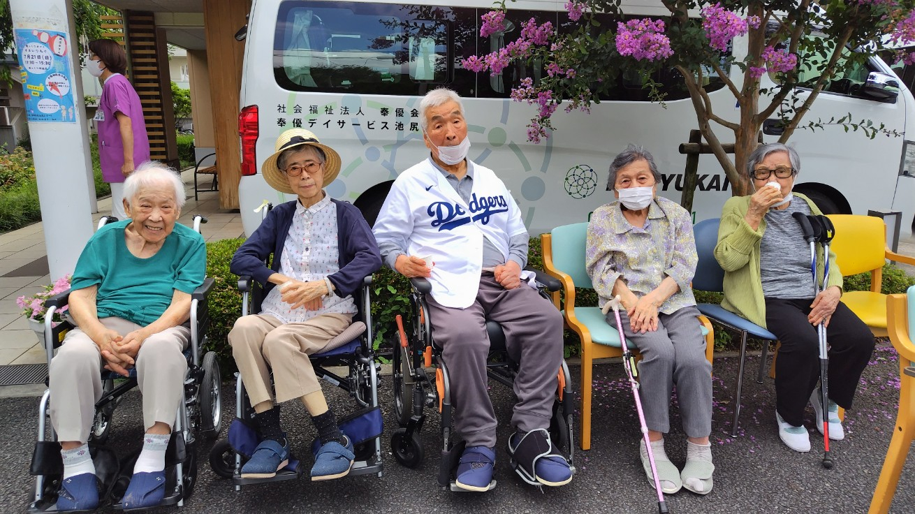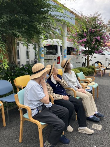 デイ建物の前にいすを並べてご希望の皆さん全員をご案内