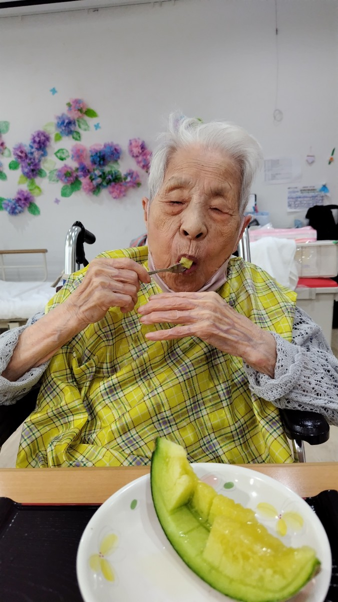 繊維が多く固形のままでは食べられない方には搾りたての生メロンジュースて提供です