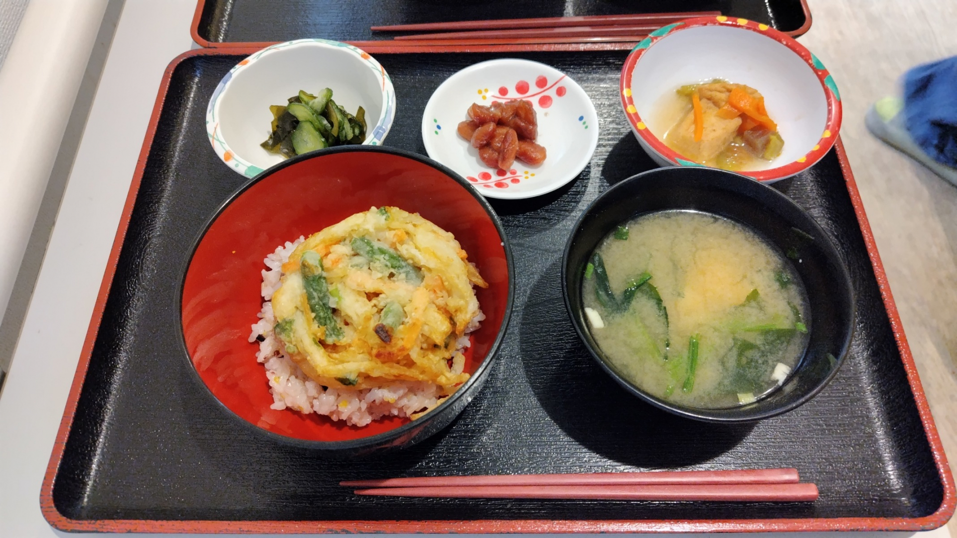 茅の輪をイメージした丸いかき揚げを乗せた八穀米ご飯に