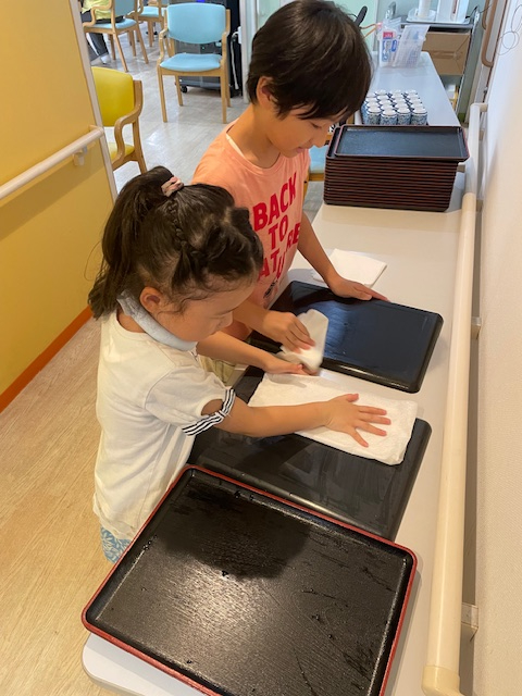 厨房でお盆拭きのお手伝いをする子供2名を発見。