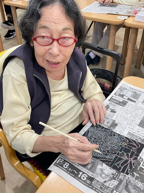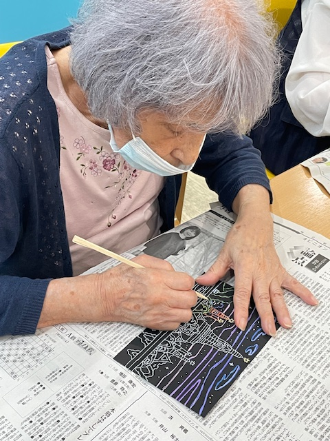 今日は選択プログラム。書道とスクラッチアートを準備してお好きな方へ参加。