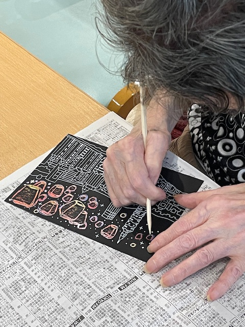 書道は文字で、スクラッチアートは絵で、それぞれ個々に楽しみます。