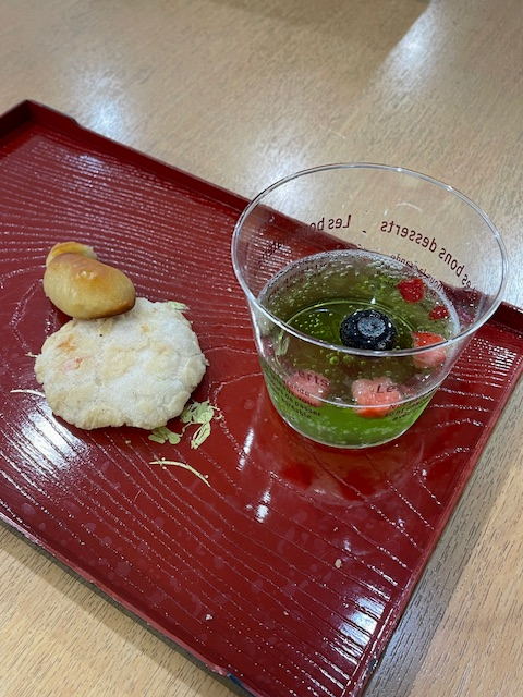 おやつにはメロンシロップで色付けをして、ベリーを添えた