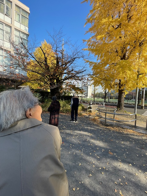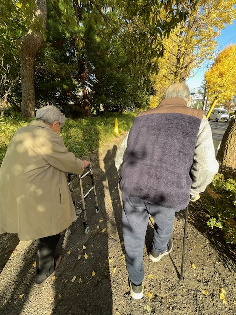 せっかくだからと、数枚の落ち葉を拾い手にし、自然と膝の屈伸運動が出来ているT様。