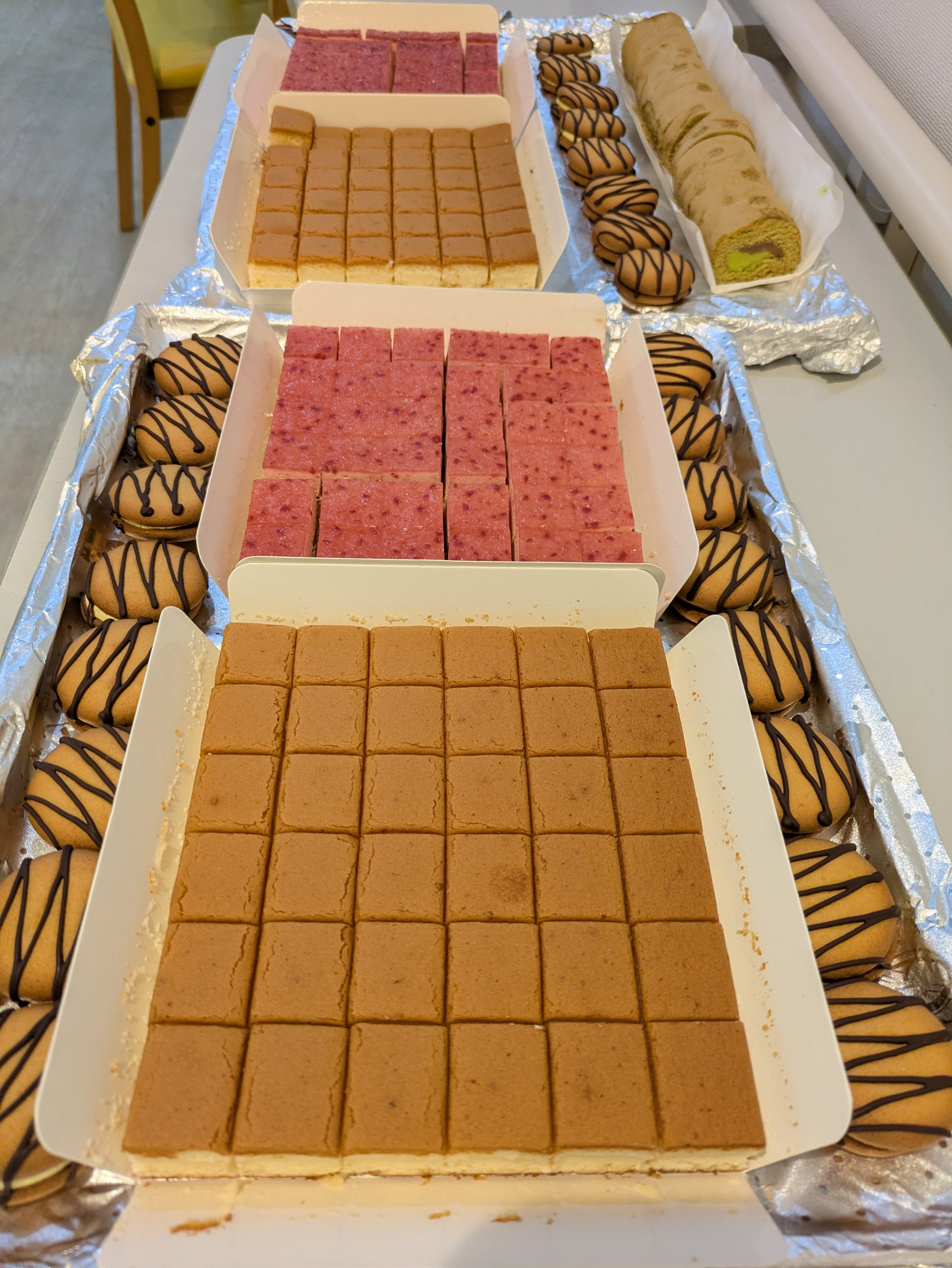 いちごのムースケーキとチーズケーキ、抹茶のロールケーキにマロンクリームサンド。
