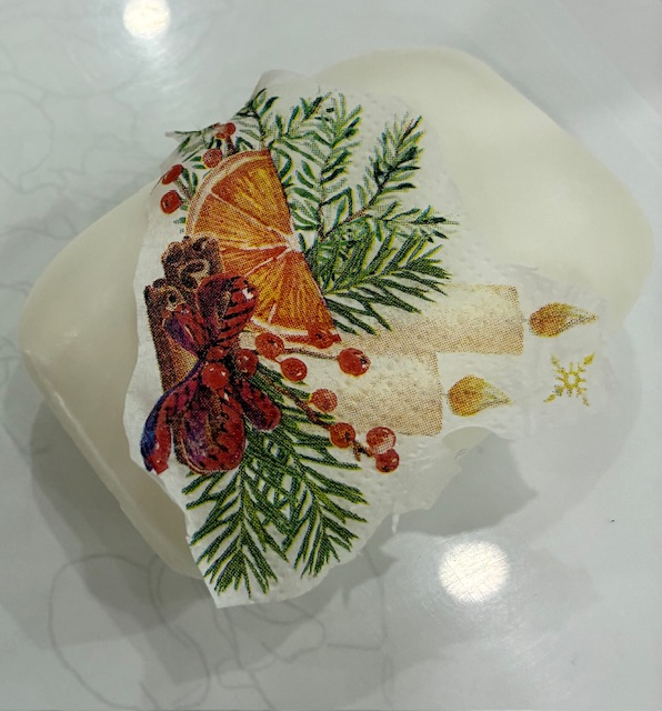 Xmas柄のペーパーナフキン。表と裏を剥がして、柄面だけを使用していきます。