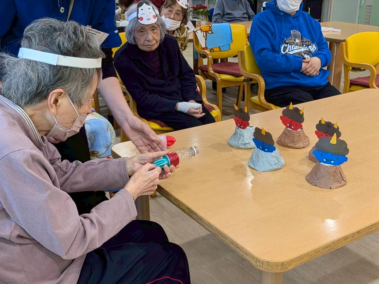 まずはご利用者様全員で被り物を被ります!容姿から節分を楽しみます!