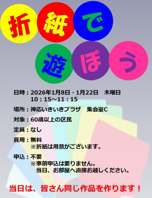 2026.01.25 神応だより2月号 お知らせ 2026.01.17 今年もよろしく、太極拳。 活動報告 #神応いきいきプラザ #太極拳 #やってみよう太極拳 2026.01.14 ゆっくりヨガ 始まりました 活動報告 2026.01.09 折紙で遊ぼう 活動報告 2026.01.04 初仕事 活動報告 2025.12.28 皆さま今年もお世話になりました お知らせ 2025.12.26 躍進中の吹矢! 活動報告 2025.12.26 入門教室無事終了しました❣ 活動報告 #麻雀 #神応いきいきプラザ #入門 2025.12.25 神応だより1月号 ニュース 2025.12.19 12月14日の仇討 活動報告 #神応いきいきプラザ 2025.12.19 新年は応援とお汁粉で❣ 活動報告 2025.12.17 空きがあります。 活動報告 #神応いきいきプラザ #フラダンス #追加募集 2025.12.17 募集開始しました。 活動報告 #神応いきいきプラザ #ボイスレッスン 2025.12.15 鬼宿の日 活動報告 #神応いきいきプラザ #正月事始め 2025.12.12 12月12日はポインセチアの日 活動報告 #神応いきいきプラザ #ポインセチア #シクラメン 1 2 3 … 37