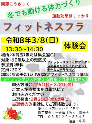 2026.02.05 空きあります、フィットネスフラ ニュース #神応いきいきプラザ #フラダンス #フィットネスフラ 2025.12.17 空きがあります。 活動報告 #神応いきいきプラザ #フラダンス #追加募集 2025.11.20 授業の振替えのお知らせです。 活動報告 #フラダンス #振替え 2025.07.03 うきうきフラセラピーが始まりました 活動報告 #神応いきいきプラザ #フラダンス #セラピー 2025.04.13 coming soon !!! お知らせ #神応いきいきプラザ #フィットネスフラ #脂肪燃焼 #有酸素運動 #フラダンス 2024.12.26 素敵な横顔 活動報告 #神応いきいきプラザ #フラダンス #花 #波 #瑠璃色の地球 2024.11.18 お待ちかね【神応だより】12月号 お知らせ #神応いきいきプラザ #バドミントン #卓球 #太極拳 #ベリーダンス #フラダンス #ヨガ #吹き矢 2024.11.14 愉快なお隣さん 活動報告 #神応いきいきプラザ #麻雀 #フラダンス 2024.10.25 満員御礼になりそうです❣ 活動報告 #神応いきいきプラザ #フラダンス #瑠璃色の地球 2024.07.25 外も中も常夏 活動報告 #神応いきいきプラザ #フラダンス #フキラウソング #水分補給 2024.05.15 常夏の風に吹かれて~♡ 活動報告 #神応いきいきプラザ #フラダンス #ウクレレ #合唱 2024.05.05 季節のコンサートのご案内❕ お知らせ #神応いきいきプラザ #コンサート #フラダンス #教室 #生演奏 2024.04.10 コンサートに向けて!!! お知らせ #神応いきいきプラザ #コンサート #生演奏 #フラダンス 2024.03.27 男性大募集です!! 活動報告 #神応いきいきプラザ #フラダンス #体操 #男性