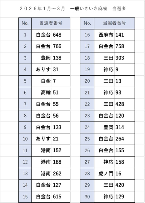 2026年1月~3月 神応いきいき麻雀 当選者発表