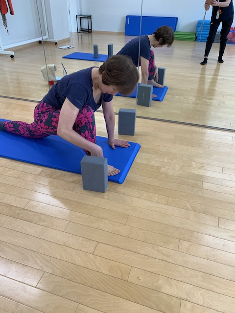 補助具のブロックを使って足を交差して